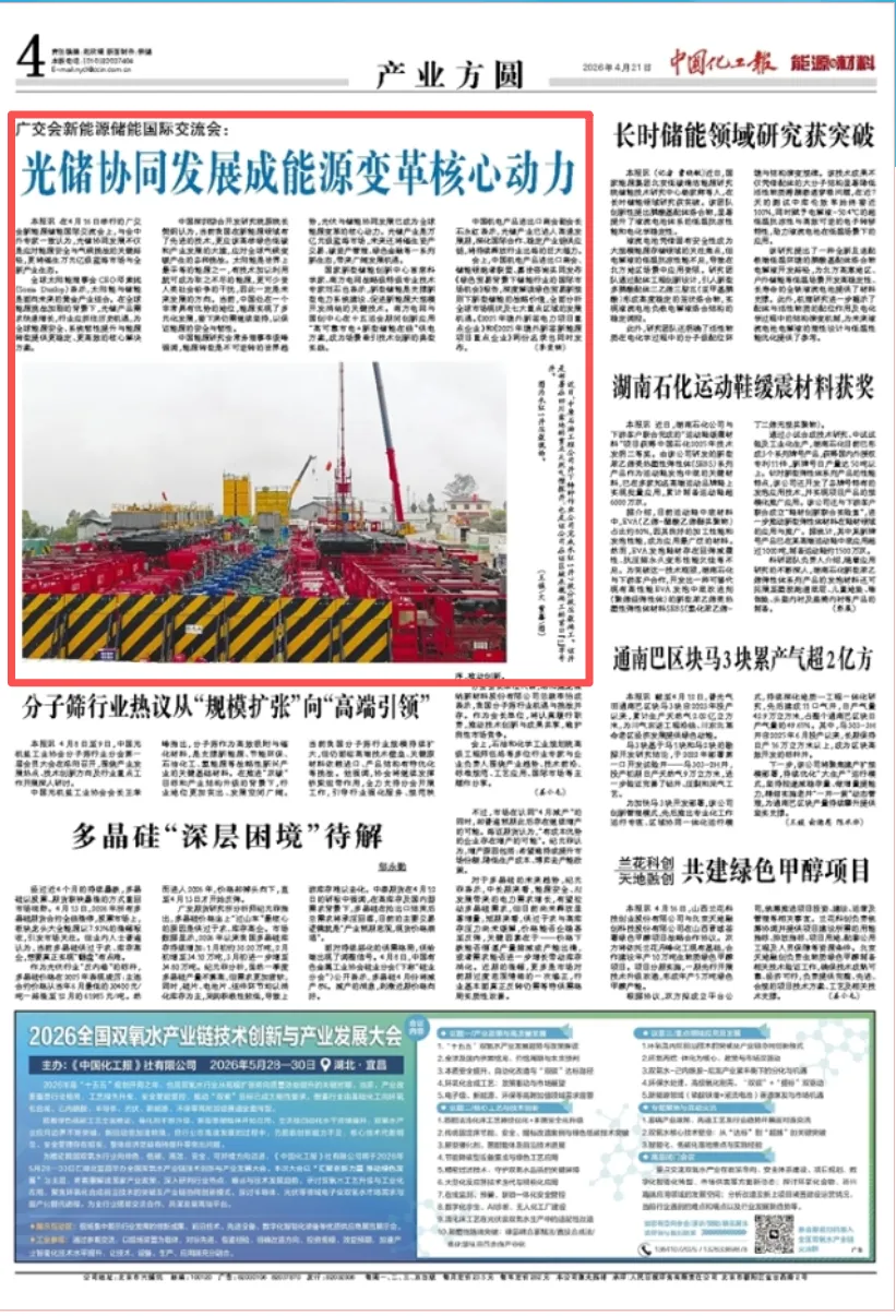 4月21日,中国化工报刊发《广交会新能源储能国际交流会:光储协同发展成能源变革核心动力》,内容如下: