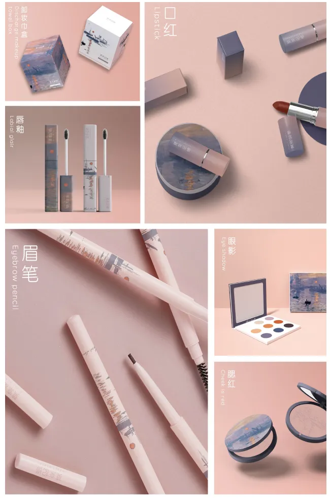 “莫奈记忆”美妆系列产品,设计者的灵感则来源于莫纳的画作。他们根据莫奈画作中大自然光色的特点,充分融入美妆产品设计,从《日出·印象》中摄取眼影色号,口红渐变色,构造出线图的形式加以创新设计;从《睡莲》系列早晚景象结合早晚面膜的概念设计外观。