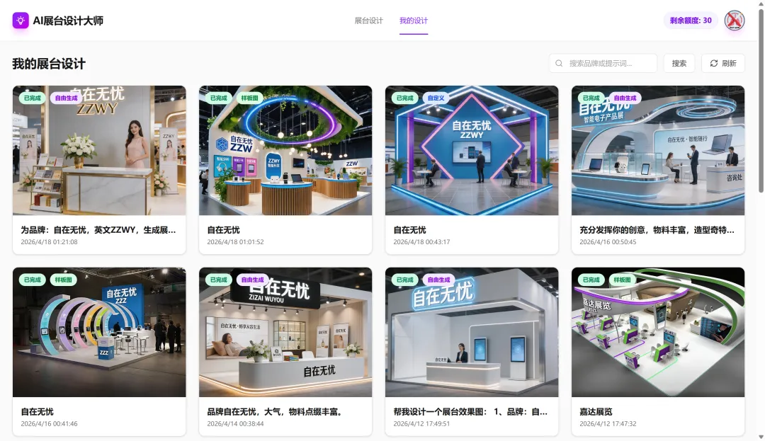 AI展台设计大师,支持自然语言输入,几十秒即可生成极具创意的展台效果图: