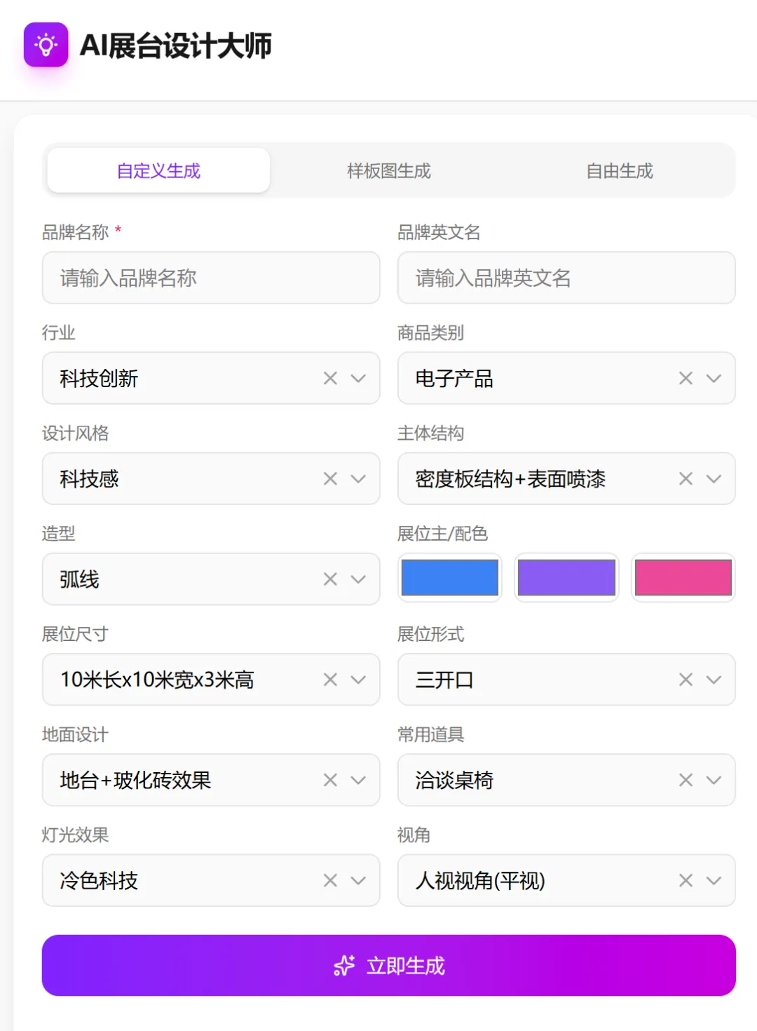 输入客户企业品牌、选择行业、商品类别、设计风格、展位主色、配色、主体结构、展位尺寸、双开口还是三开口、造型、地面设计、灯光效果、视角、道具即可一键生成想要的图。