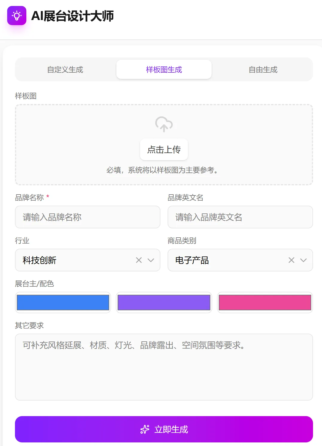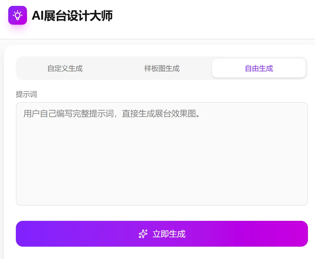 还是觉得麻烦,AI展台设计大师还提供自由生成,简简单单一句话,即可帮你生成极具创意的展台效果图出来: