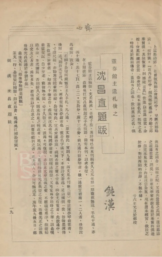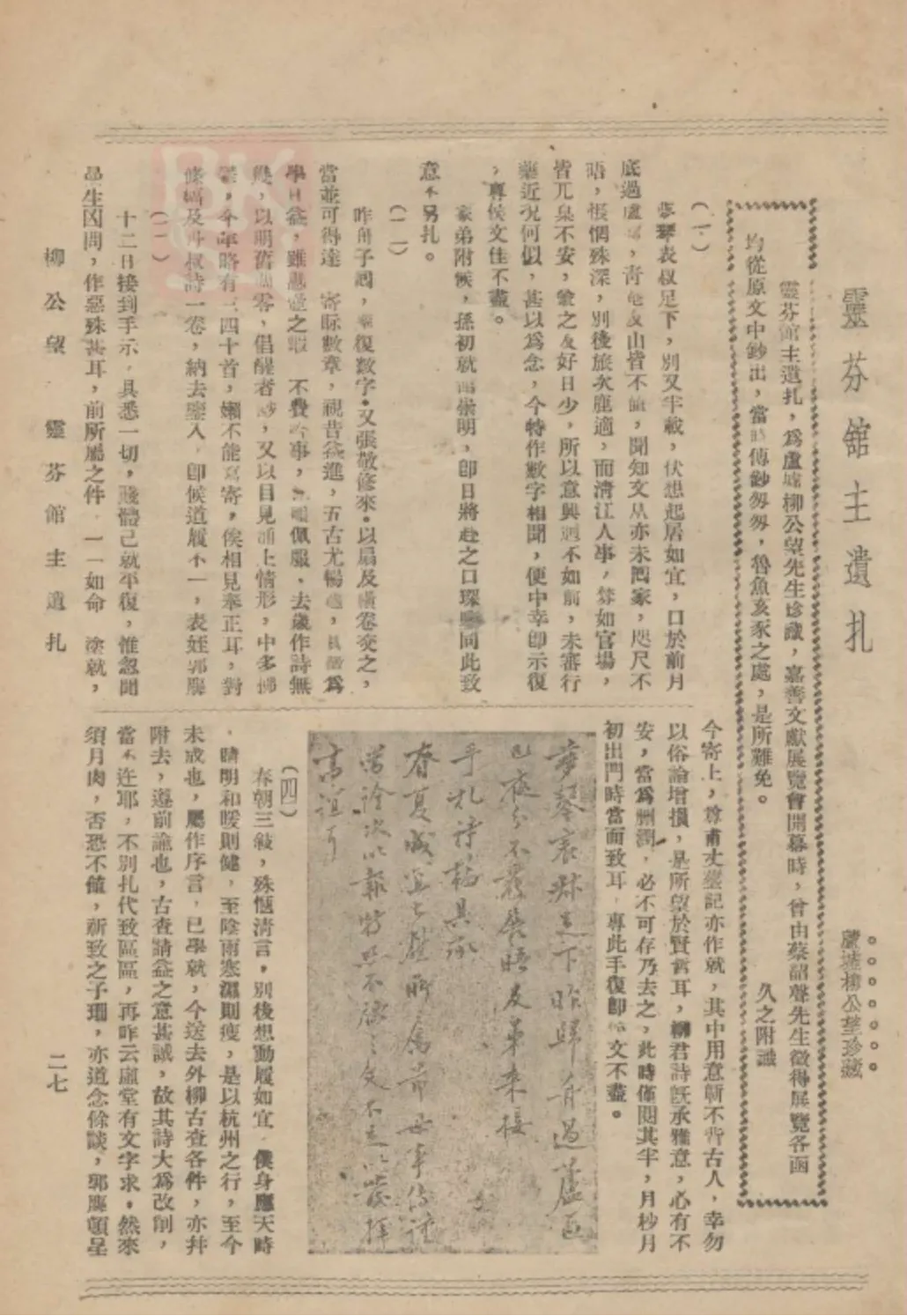 (《乡心》刊 灵芬馆主遗札 书影)