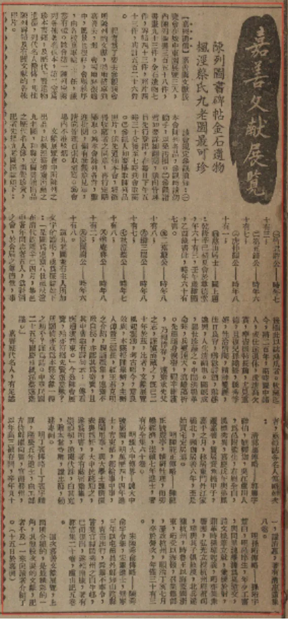 这次展览会,1936年10月17日《大公报(上海)》有长篇报道,题为:“嘉善文献展览:陈列图书碑帖金石遗物 枫泾蔡氏九老图最珍可珍”。
