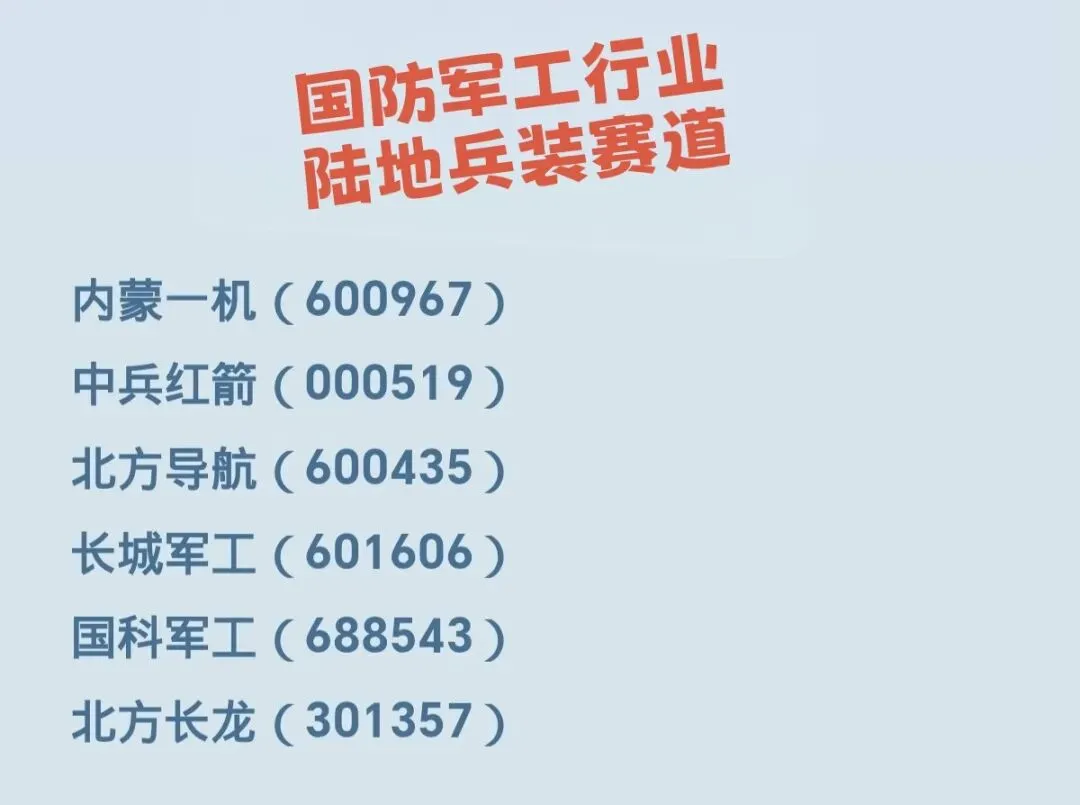 - 中兵红箭(000519):智能弹药、远程火箭弹、末敏弹龙头;弹药体系核心供应商,部分产品技术独占,受益精确制导装备列装。