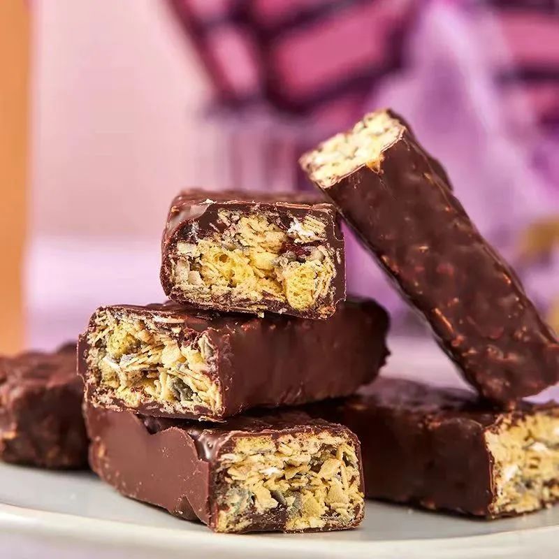 产品介绍:国内首家采用进口厄瓜多尔可可豆、澳大利亚燕麦片、大米、乳清蛋白粉、蔓越莓干等挤压成型,再涂层巧克力而成。