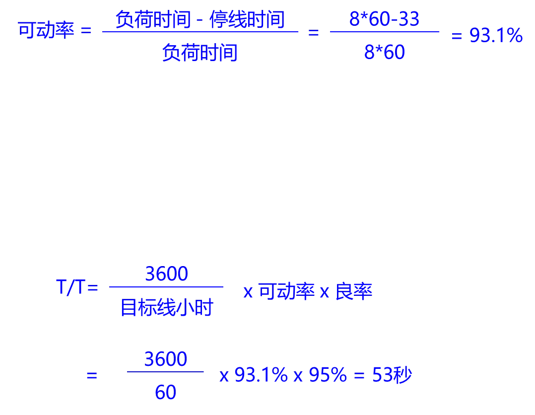 (2)本条线设定线小时目标以60台/小时(即60UPH)为例,计算这条线的需求T/T(节拍时间)则为(这条线的平均良率为95%):
