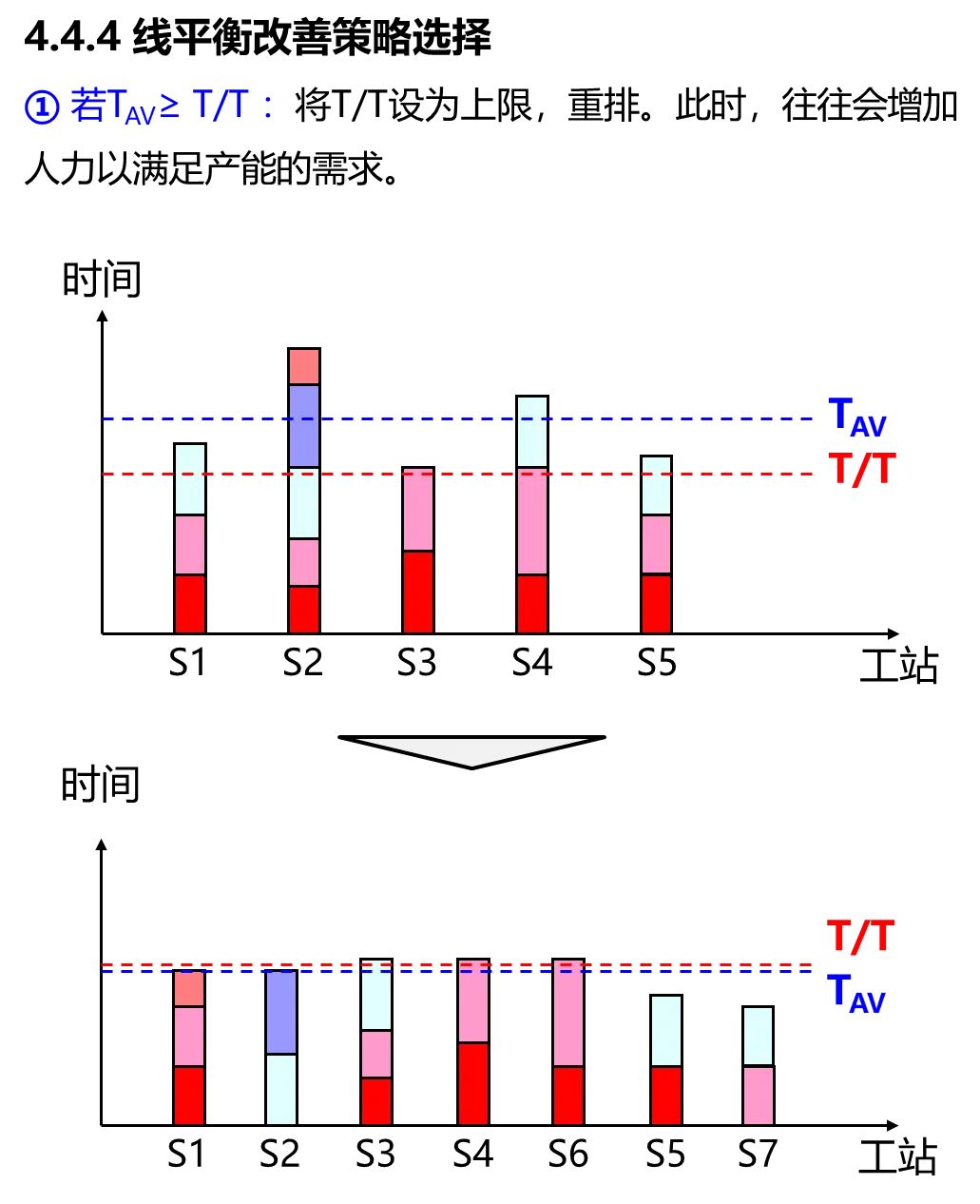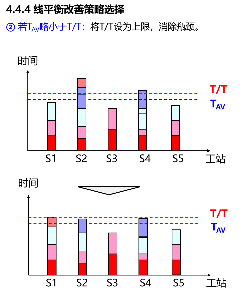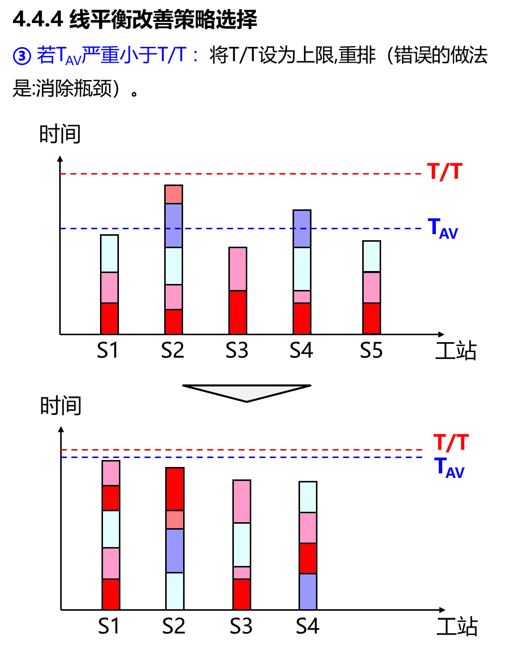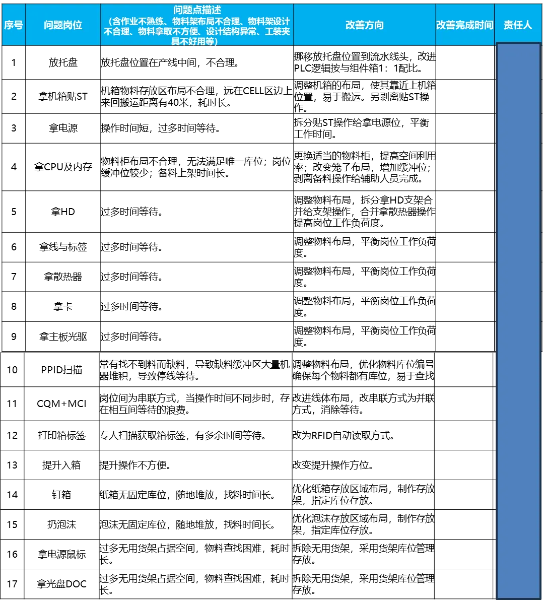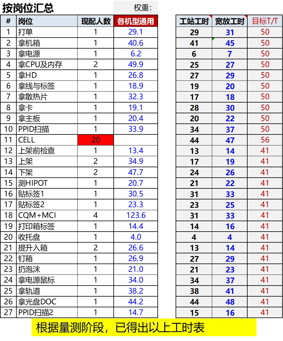 根据观测的实际结果,TAV远小于T/T,说明平均工时远小于目标工时,说明岗位负荷度不足。另外也存在岗位瓶颈。因此改善策略既要解决岗位瓶颈,又要对岗位进行重排( T/T设为上限),提高岗位负荷度。