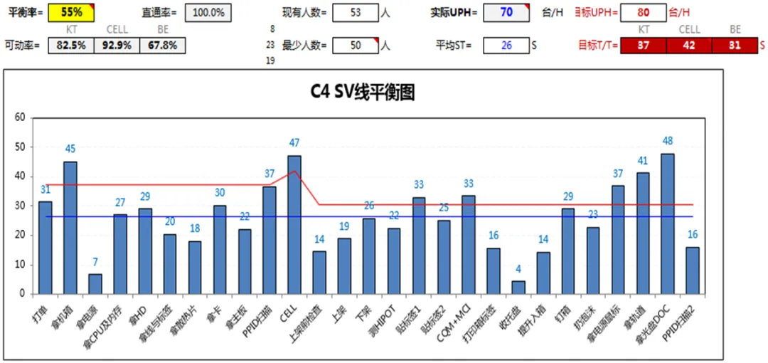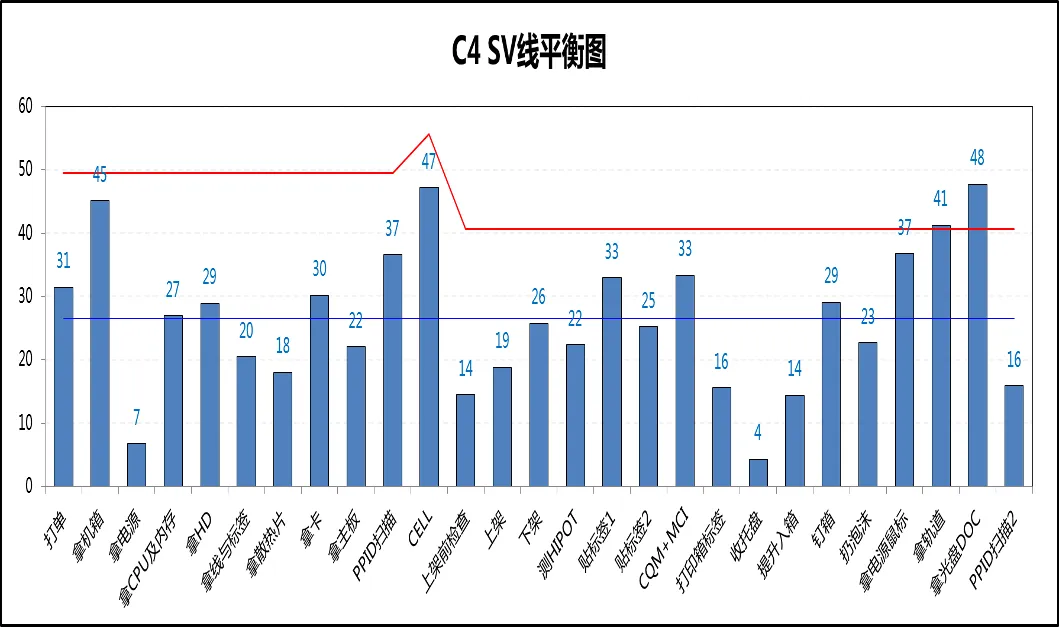②生成山积图:通过分析山积图及相关的数据你就能制订出线平衡的策略(以C4 ESG LINE 60UPH为例)