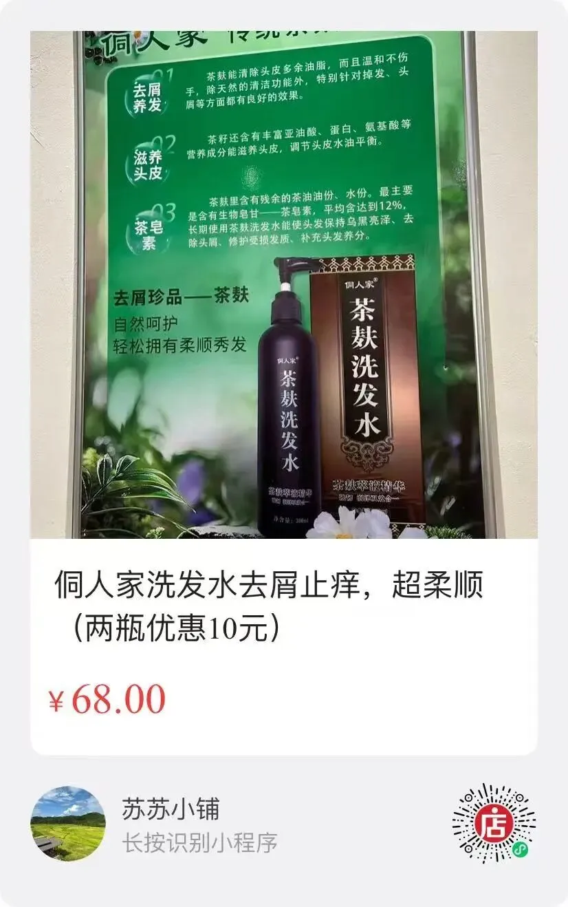 1)产于广西三江的侗人家茶麸洗发水,洗了头发柔顺,去屑去油功能也很不错,广西三江是一个茶叶基地,小时候我也经常看到奶奶他们那辈人拿茶麸煮开洗头发,头发又油又亮。68/瓶,每瓶300毫升。拍两瓶的留言我改价格,也可以私聊我下单。
