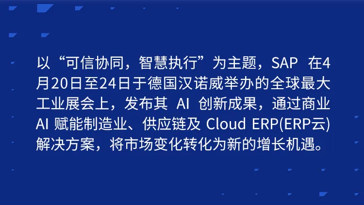 SAP 宣布参加于4月20日至24日在德国汉诺威举行的全球最大工业贸易展会——汉诺威工业博览会2026,展示其由智能体 AI 驱动的制造与供应链创新解决方案。SAP 今年以“可信协同,智慧执行”为主题,展示商业 AI 如何从根上重塑企业核心运营流程的愿景。