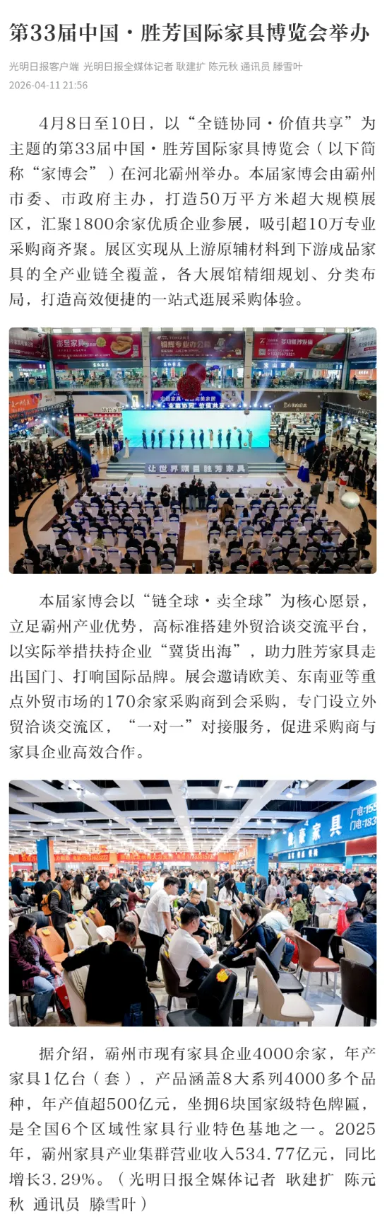 4月11日,光明日报客户端发布稿件《第33届中国・胜芳国际家具博览会举办》。报道如下: