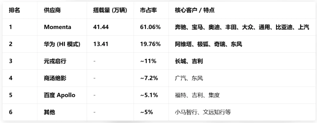 Momenta(北京初速度科技有限公司)是全球领先的自动驾驶公司,核心定位是为车企提供全栈式智能驾驶解决方案,以 “数据飞轮” 和 “两条腿走路” 战略著称,是中国自动驾驶领域的头部独角兽。创始人 / CEO:曹旭东,前微软亚洲研究院科学家、商汤科技研发总监定位:AI 驱动的自动驾驶技术公司,赋能车企与出行生态通过量产车采集海量真实数据 → 算法迭代 → 反哺量产产品 → 更多车辆上路 → 更多数据,形成闭环自动化,快速迭代能力全栈自研:感知、预测、决策、规划、控制、高精地图、数据闭环飞轮大模型:R6/R7 端到端大模型,融合强化学习与世界模型,主打城市 NOA与低依赖高精地图量产能力:车规级、高性价比、快速适配,支持多传感器配置(摄像头 / 雷达 / 激光雷达)To B(核心):向车企授权智驾软件 / 算法 / 解决方案口径:2025 年 1-11 月,城市 NOA 新车搭载量(第三方)Momenta + 华为合计市占率 > 80%,形成双强垄断Momenta 优势:覆盖全球 Top10 车企中的 8 家,160 + 款车型,BBA + 日系 + 美系 + 自主全生态面向前装量产,为车企提供高速 NOA、城市 NOA、记忆泊车、行泊一体等方案代表产品:Mpilot Pro、Mpilot X(基于 NVIDIA Orin 等芯片)已落地超 130 款量产车型,覆盖上汽、丰田、奔驰、宝马、奥迪、比亚迪等2.MSD(Momenta Self Driving,L4 无人驾驶)面向Robotaxi / 无人出租车与未来完全自动驾驶全球车企:上汽(智己)、丰田、奔驰、宝马、奥迪、通用、比亚迪等合作模式:深度共研 + 软件授权(奔驰标准安全验证)核心方案:无图端到端高阶智驾(基于 R6 大模型)功能:高速 NOA、城市 NOA(无高精地图)、记忆泊车、代客泊车、点到点领航核心方案:Momenta 飞轮大模型 + 全场景点到点领航功能:城区 NOA、高速 NOA、自动变道、红绿灯 / 环岛通行、跨城点到点(车位→城区→高速→城区→车位)落地车型:新世代 BMW iX3 长轴距(2026 量产)核心方案:“德系电动豪华 + 飞轮大模型” 专属智驾核心方案:IM AD 3.0(基于 Momenta 一段式端到端)功能:全球首批量产一段式端到端大模型、高速 / 城市 NOA、无图化、代客泊车、跨城领航落地车型:智己 LS7、LS6、L7、LS9 全系功能:城市 NOA、高速 NOA、行泊一体、油电同智(燃油 / 纯电均适配)落地车型:ID. 系列(ID.4 X、ID.6 X、ID.7、ID. ERA)核心方案:Momenta R6 强化学习大模型(全球首发)功能:无断点城市 NOA、不停车一键泊入、全场景领航、自动避让、复杂路口处理合作模式:“丰田 + Momenta + 华为” 三位一体功能:高速 / 城市 NOA、记忆泊车、拥堵辅助、丰田 TPS 安全体系 + Momenta AI 融合落地车型:广汽丰田 铂智 3X、铂智 7、一汽丰田 bZ3、bZ5 智享家合作模式:合资公司 DiPi Intelligent Mobility核心方案:DiPilot 高阶(L2++) 行泊一体功能:高速 NOA、城市领航、记忆泊车、自动变道、适配比亚迪 e 平台 3.0/4.0(天神之眼A/B/C)核心方案:Mpilot Pro 无图 NOA、高速 / 城市 / 泊车全场景核心方案:Mpilot X 高阶智驾、端到端城市 NOA落地车型:AION V 二代、AION S、AION LX 等核心方案:“猎鹰” 高阶辅助驾驶(R6 深度共创)落地车型:风云 A9、风云 T11、风云 A9L 光辉等核心方案:欧盟合规高阶智驾、高速 NOA + 自动泊车25年营收约25~30亿,亏损15~20亿,量产落地最强26年冲刺港股IPO:计划2026年上市,估值约80~100亿美元
