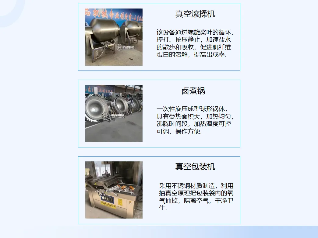 烧鸡加工生产线设备,熟食卤肉整套加工设备厂家大功率加热使熏鸡外焦里嫩,又不会掉秤,熏鸡口感松软,采用大功率发烟盘,糖熏木熏都可以,发烟快,发烟量大着色效果好,可以达到15分钟出一炉。带有循环风机,使产品的着色均匀。