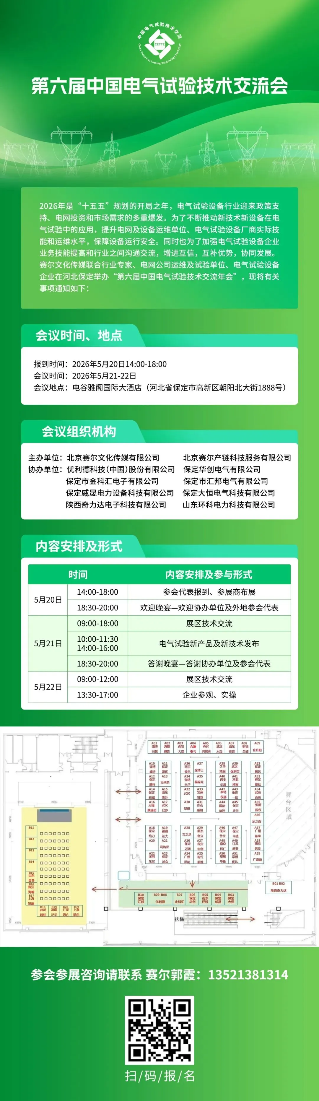 为帮助企业精准对接需求、拓展合作渠道、提升技术竞争力,第六届中国电气试验技术交流年会应运而生。本届会议由赛尔文化传媒主办,多家头部企业联合协办,延续第五届高效对接、务实办会的风格,集展示、交流、发布、参观于一体,覆盖从电网单位、检测机构到设备厂商、代理商的全产业链,全程免费参会,是企业展示实力、拓展客户、学习提升的最佳平台。
