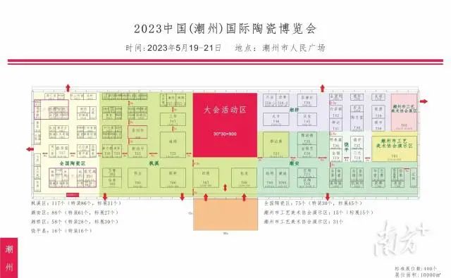 本次展会规模达1万平方米,共设置标准展位400余个。规划七大主题展区,包括有全国陶瓷区、枫溪展区、湘桥展区、潮安展区、饶平展区、工艺美术区、陶瓷演示区。