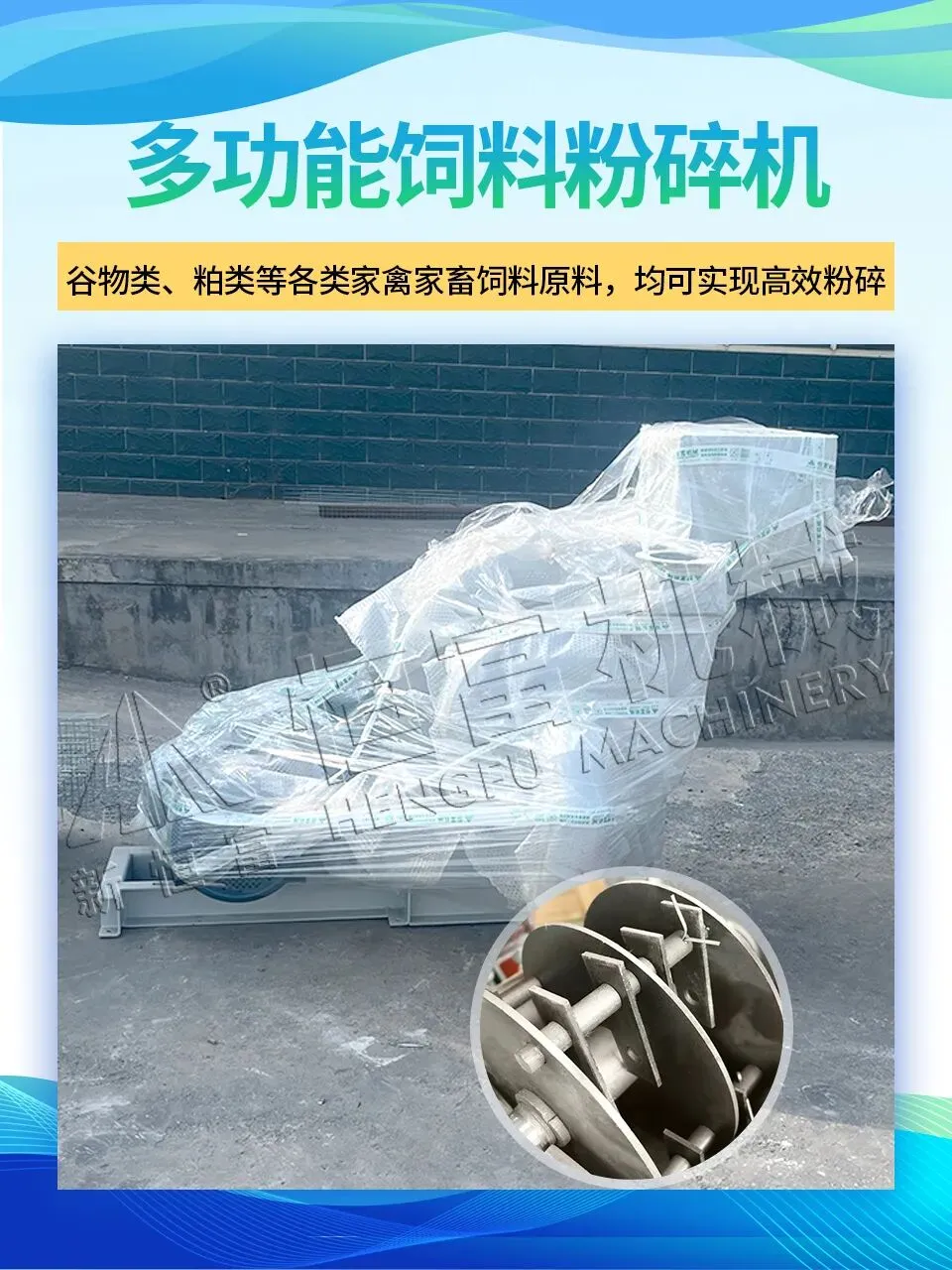 多功能饲料粉碎机:型号9FQ50-33,功率15kw,产量0.4-1T/H,能同时粉碎谷物、秸秆、牧草、苜蓿、稻壳等多种饲料原料。