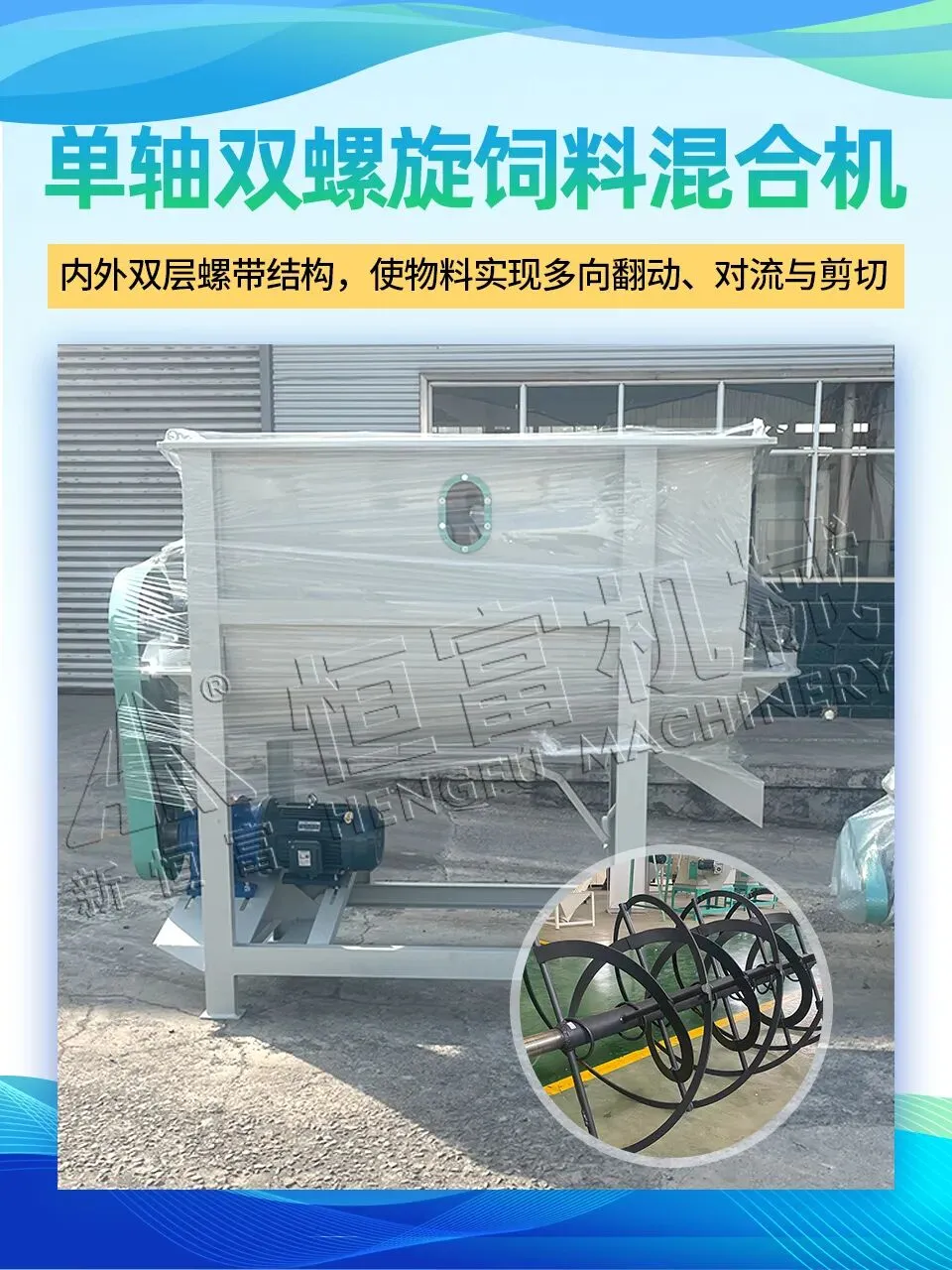 单轴双螺旋饲料混合机:型号9HWP500,功率7.5kw,产量500kg/批,混合均匀度高,CV≤7%,3-6分钟就可以混合一批料,有碳钢和不锈钢两种材质可选。