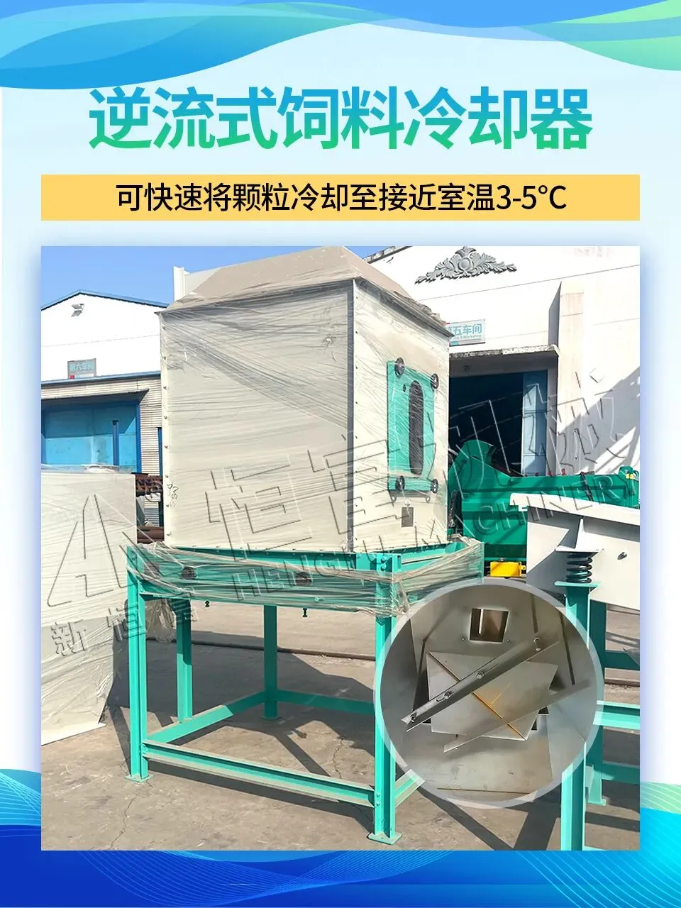 可以快速冷却制粒后的温度,降低颗粒中的水分,颗粒变干变硬,便于储存运输饲喂,避免颗粒发霉变质。