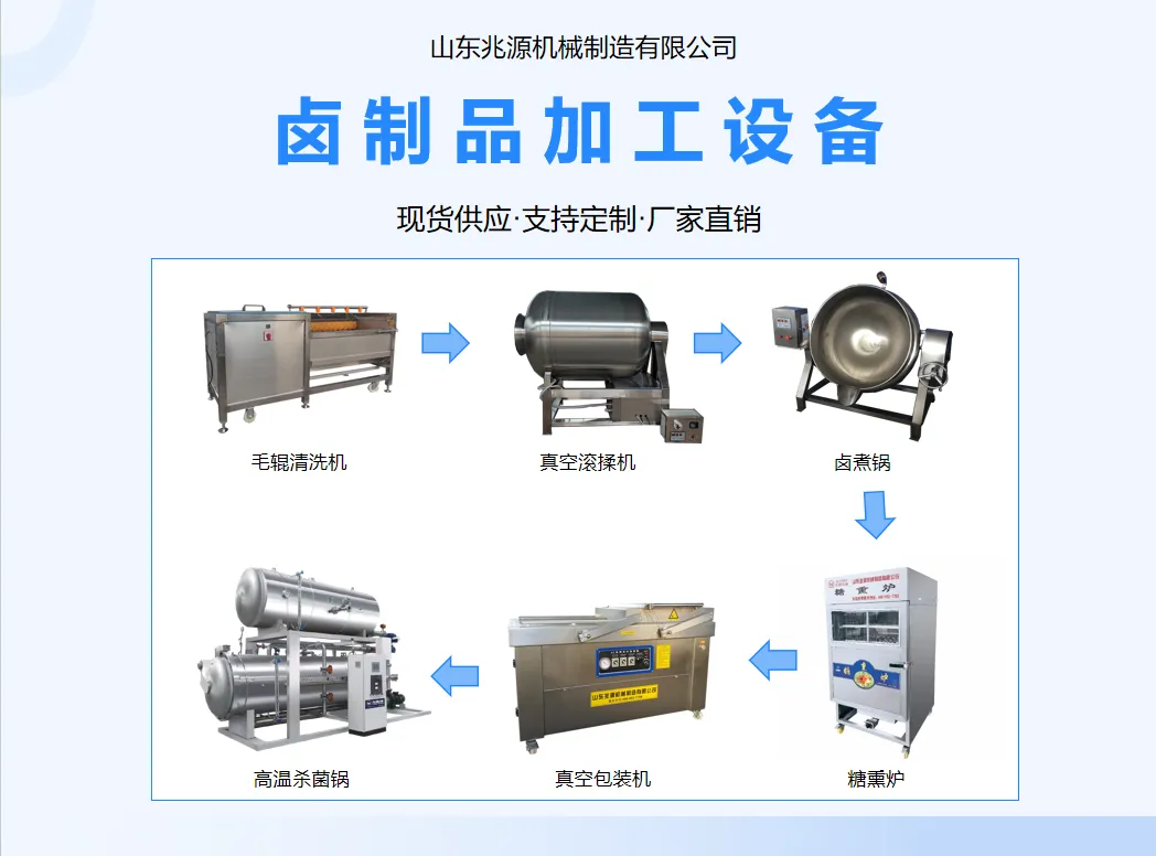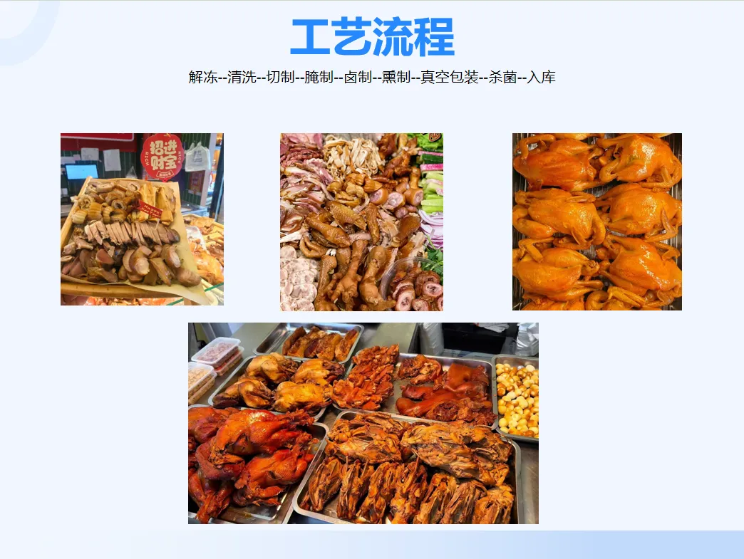 昨天去我们的附近的一家熟食店买了一些熏鸡,香肠啥的,味道挺好的,在等老板帮我拌凉菜的空挡,我们沟通了一下他是怎么去加工产品的,首先加工熏鸡熟食要起大早去卤煮,把产品卤煮入味,我跟他说我们是做机器的,完全了可以选择卤煮锅,还有就是烟熏炉加工,如果有这两台机器,老板产量不大,一天加工下来起码要节省他2个小时的时间。卤味熟食生产线,全套酱卤肉加工机器,鸭货卤煮设备