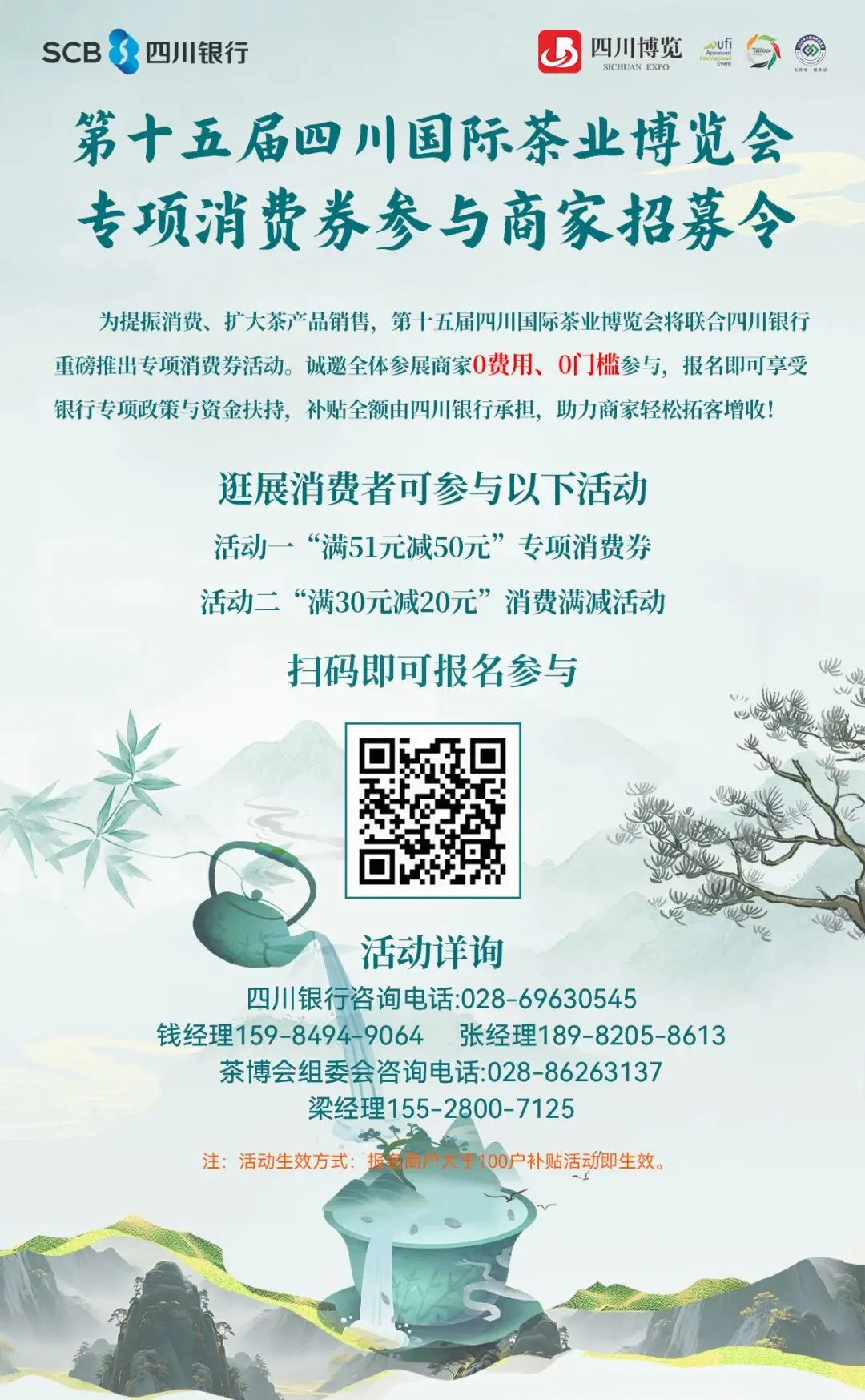 为提振消费、扩大茶产品销售,第十五届四川国际茶业博览会将联合四川银行重磅推出专项消费券活动。诚邀全体参展商家0费用、0门槛参与,报名即可享受银行专项政策与资金扶持,补贴金额由四川银行承担,助力商家轻松拓客增收!