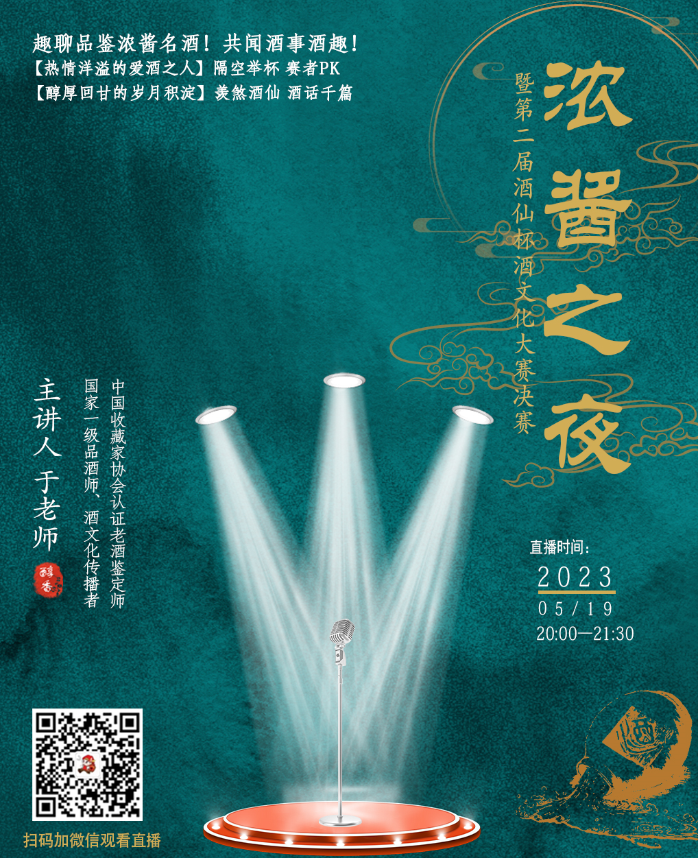 第二届“酒仙杯”决赛暨浓酱之夜即将在2023年5月19日晚上8点开启,欢迎大家围观,除了比赛还有老于对浓酱酒知识的趣味讲座。