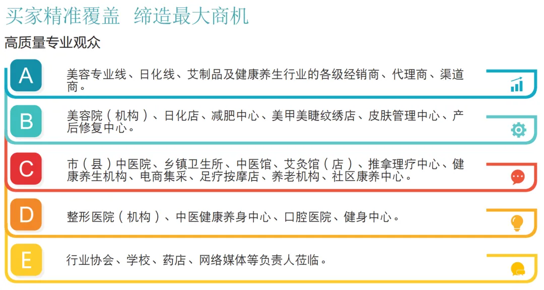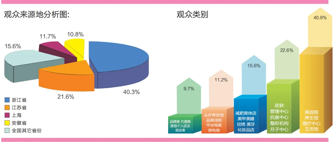 浙江省、 江苏省、安徽省、上海市的长三角经济圈的美业精英,近10万多家美容院(店)、日化店、医学美容机构及相关代理经销商登门拜访、电话、微信、请柬快递等方式邀约,建立微信群,由专人负责展会期间接待工作。