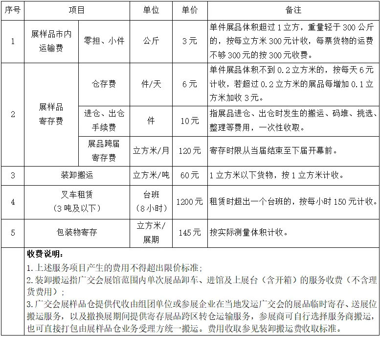 (2)搬运展品范围为广交会展馆范围内的一次装卸、搬运服务,搬运服务若超出展馆范围,由供需双方协商。