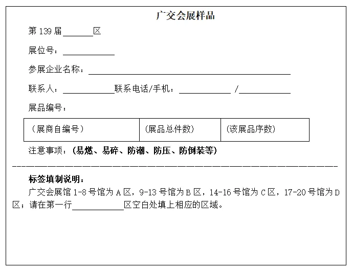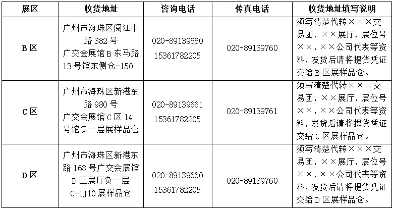 3.请勿以个人姓名为收件人。发货方请详细写明×××市×××路××号、×××公司和发货人姓名及联系电话。参展商到达广交会后凭提货凭证原件到上述展样品仓提货。提货前要先缴清广交会仓储费、搬运费和装卸费(如有)等相关费用。
