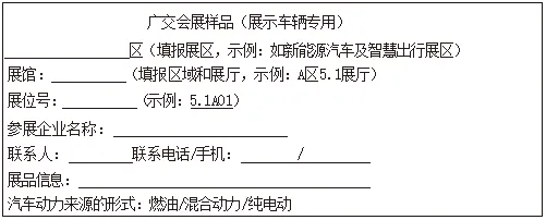 4.小型展示车辆须由另外的运载车辆运送,在大院内卸车后,再自行驶入展厅展位。展示车辆请附带广交会专用标签进入展厅,可使用A3纸自行打印,放置于车辆前挡风玻璃处,标签样式如下: