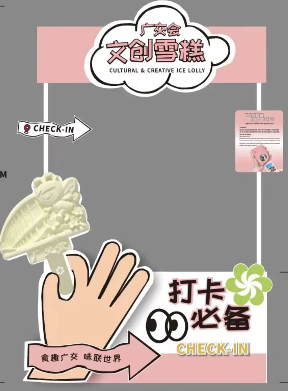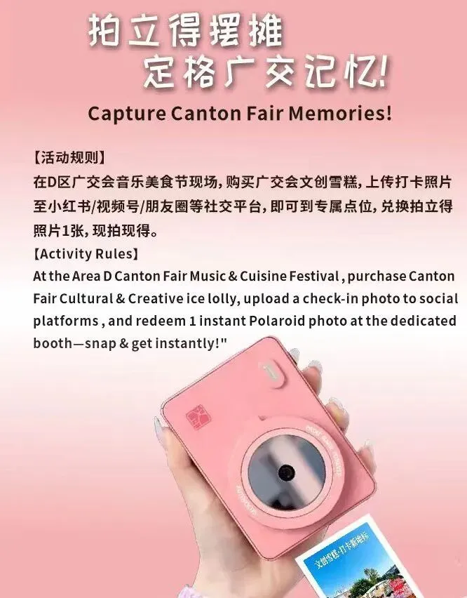 在D区广交会音乐美食节,现场购买广交会文创雪糕,上传打卡照片至小红书/视频号/朋友圈等社交平台,即可到专属点位兑换拍立得照片1张,现拍现得。