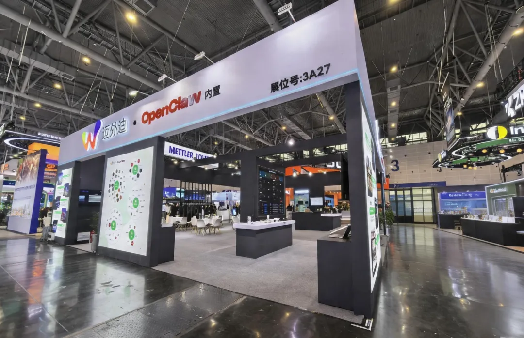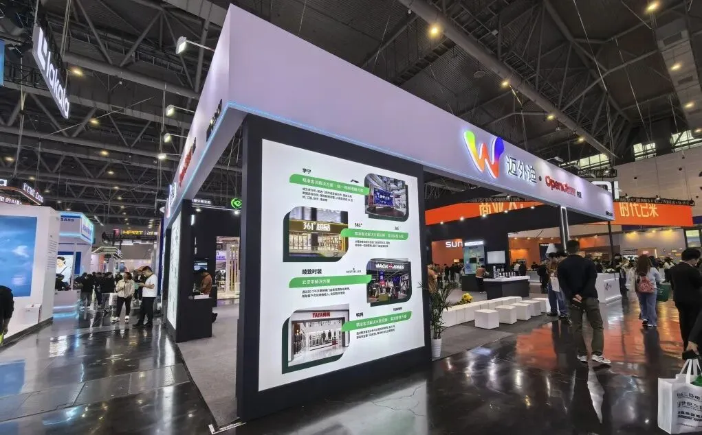 立面版面经过精细化排布,将企业服务、技术优势、零售行业落地案例分区规整,图文层级清晰有序,路过观展人群可快速完成品牌认知。空间内部动静分区规划严谨,前场接待导流、中段产品体验、内侧洽谈三区形成完整闭环的流畅动线,兼顾引流、展示与商务洽谈多重需求。