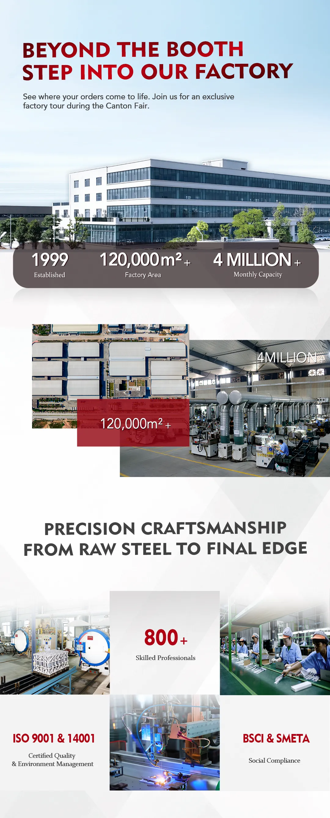 Our factory now operates in a brand-new 120,000 m² state-of-the-art facility with over 800 employees. As a leading manufacturer since 1999, we deliver a monthly capacity of 4 million knives to top-tier brands in 70+ countries.Our production and management strictly follow international standards, ethical practices, and environmental sustainability.