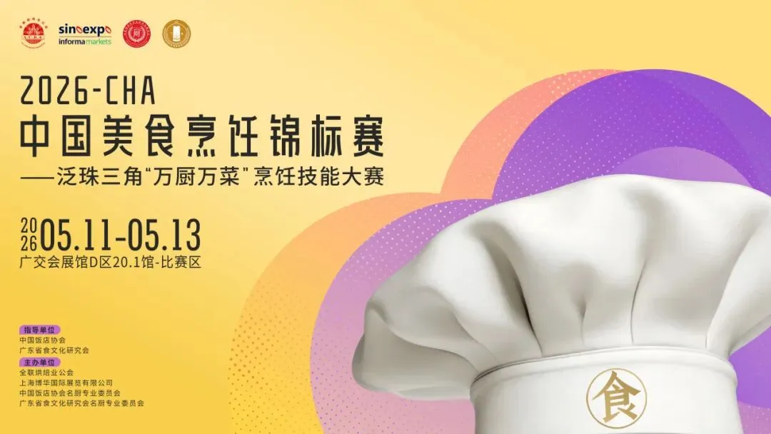 为充分发挥职业技能竞赛在促进人才培养、激发创新活力方面的重要作用,推动泛珠三角地区餐饮文化的传承与创新,中国饭店协会名厨专业委员会联合广东省食文化研究会名厨专业委员会,定于5月中旬在广东省琶洲区隆重举办2026CHA中国美食烹饪锦标赛——泛珠三角“万厨万菜”烹饪技能大赛。
