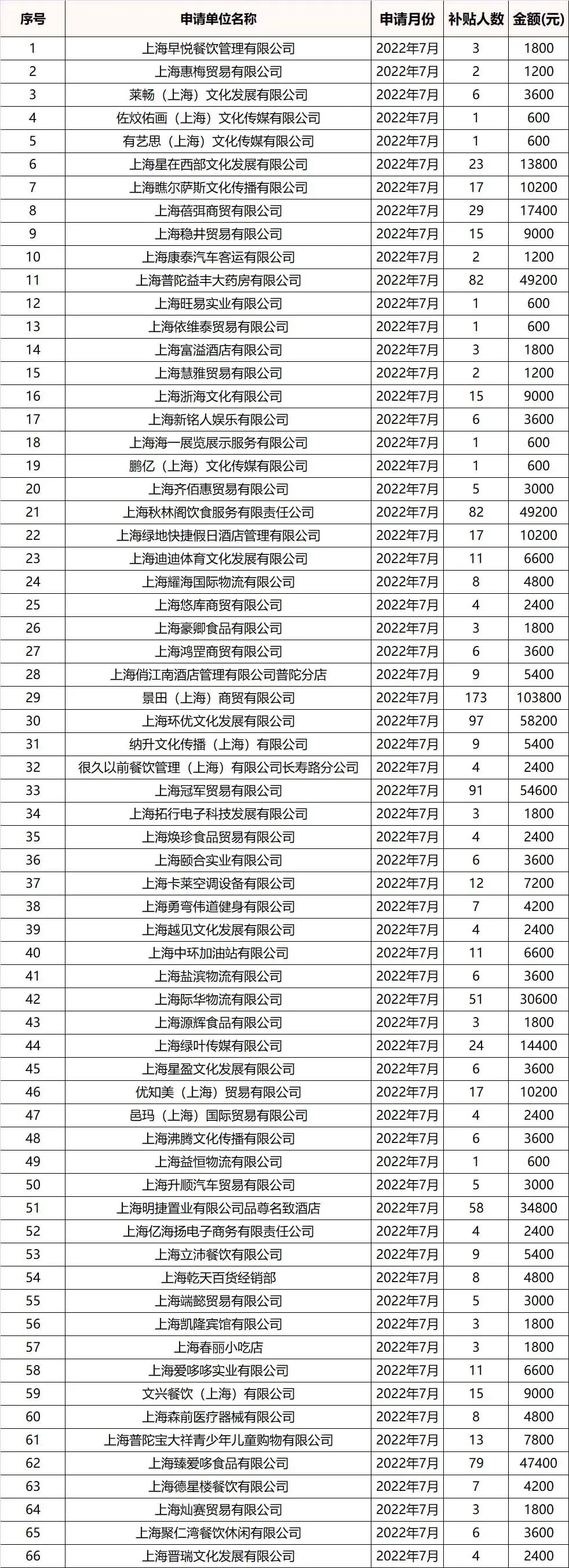 按照《关于给予本市相关用人单位就业补贴应对疫情稳岗保就业的通知》(沪人社规〔2022〕18号)的有关要求,经审核,现将对受疫情影响较大的困难行业企业给予稳就业补贴的情况进行公示,接受社会监督。公示期限:2022年7月22日至7月29日。