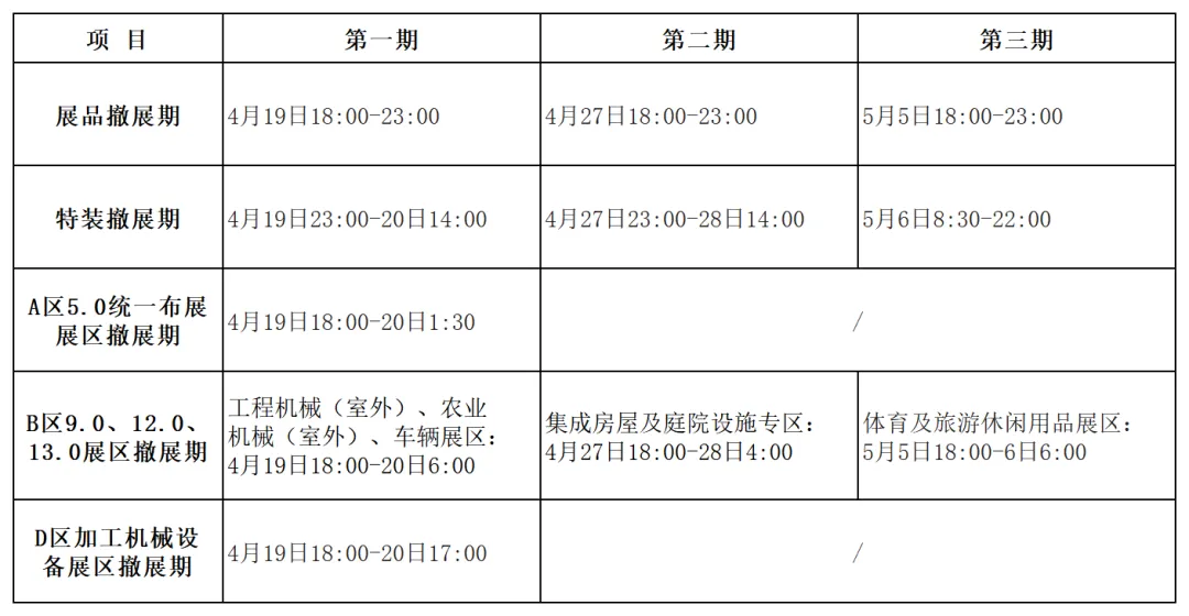 所有展厅展品的清空时间段为撤展当天18:00-23:00,23:00后大会将组织人员对展厅内无人值守的展品、包装物进行清理。第二期集成房屋及庭院设施专区需在4月28日4:00前完成撤展。