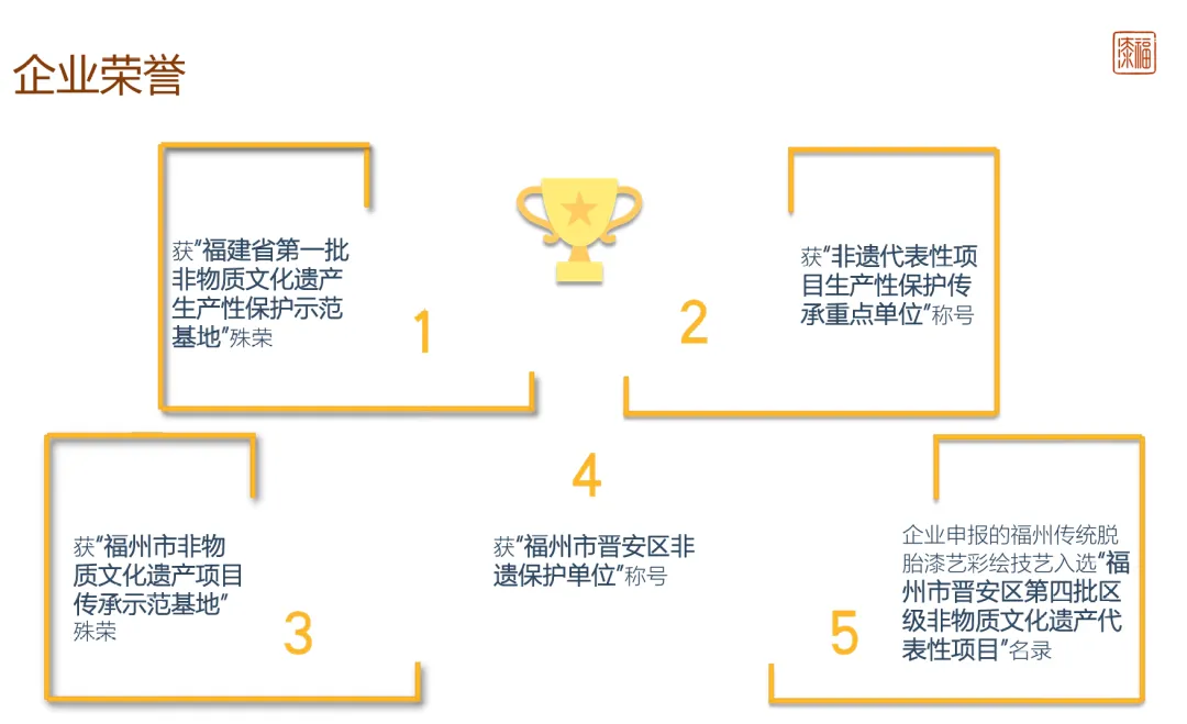 企业创作的福漆产品,以天然大漆、麻布、金、银螺钿等为原材料,制作过程坚守福州传统脱胎漆器髹饰技艺(国家非遗项目)。旗下产品常作为商务礼品、室内装饰艺术品等,深受广大客户喜爱。