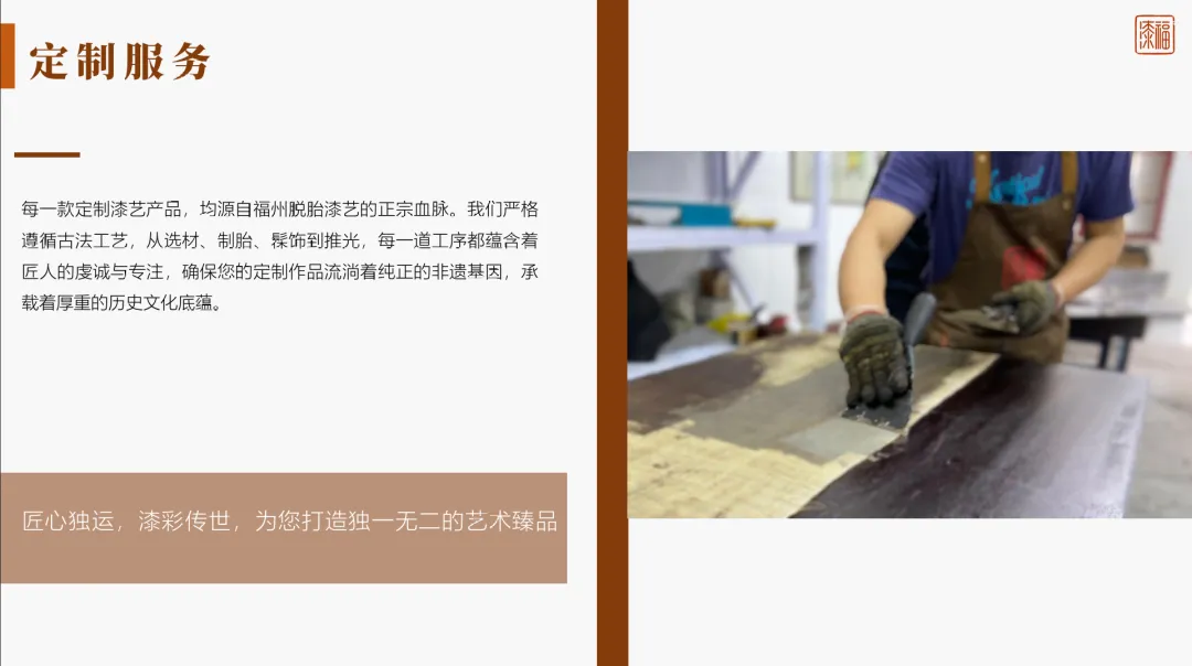 每一款定制漆艺产品,均源自福州脱胎漆艺的正宗血脉。我们严格 遵循古法工艺,从选材、制胎、髹饰到推光,每一道工序都蕴含着 匠人的虔诚与专注,确保您的定制作品流淌着纯正的非遗基因,承 载着厚重的历史文化底蕴。