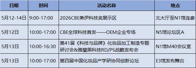 20+场配方科技论坛与2026CBE美伊科技奖展区,围绕市场趋势及消费者洞察,探讨推动品牌和产品进一步差异化的创新技术、品类及剂型创新,如以油养肤、产学研协同创新等消费人群的新产品等。