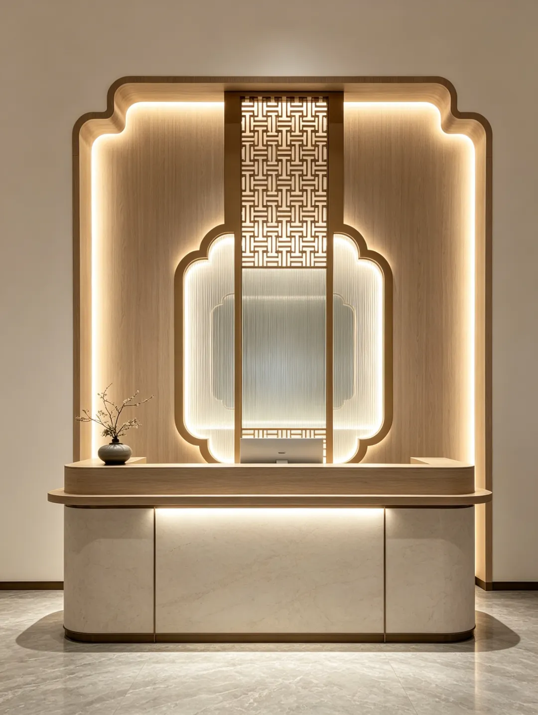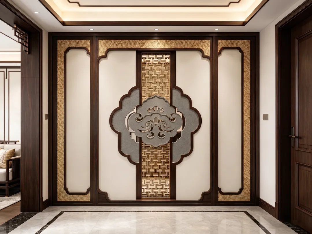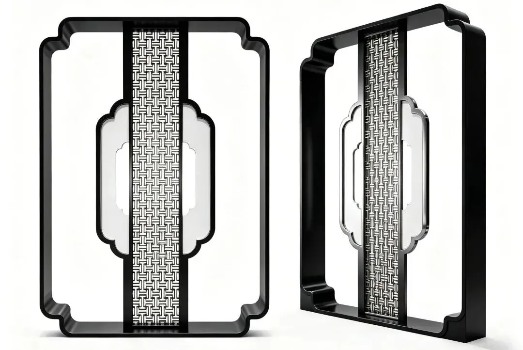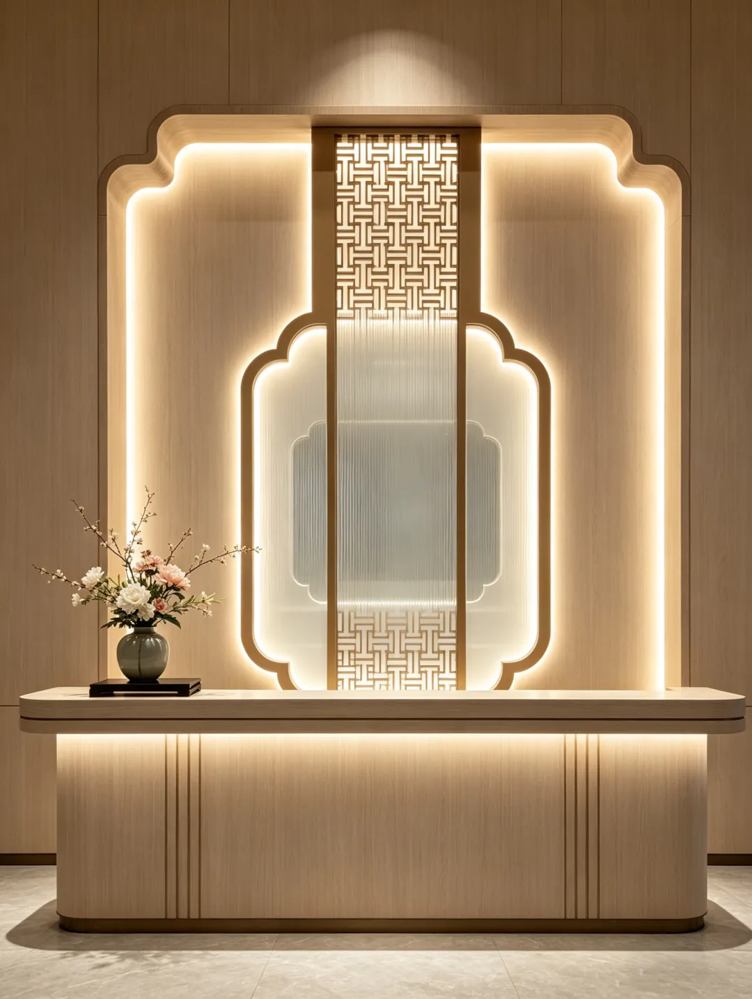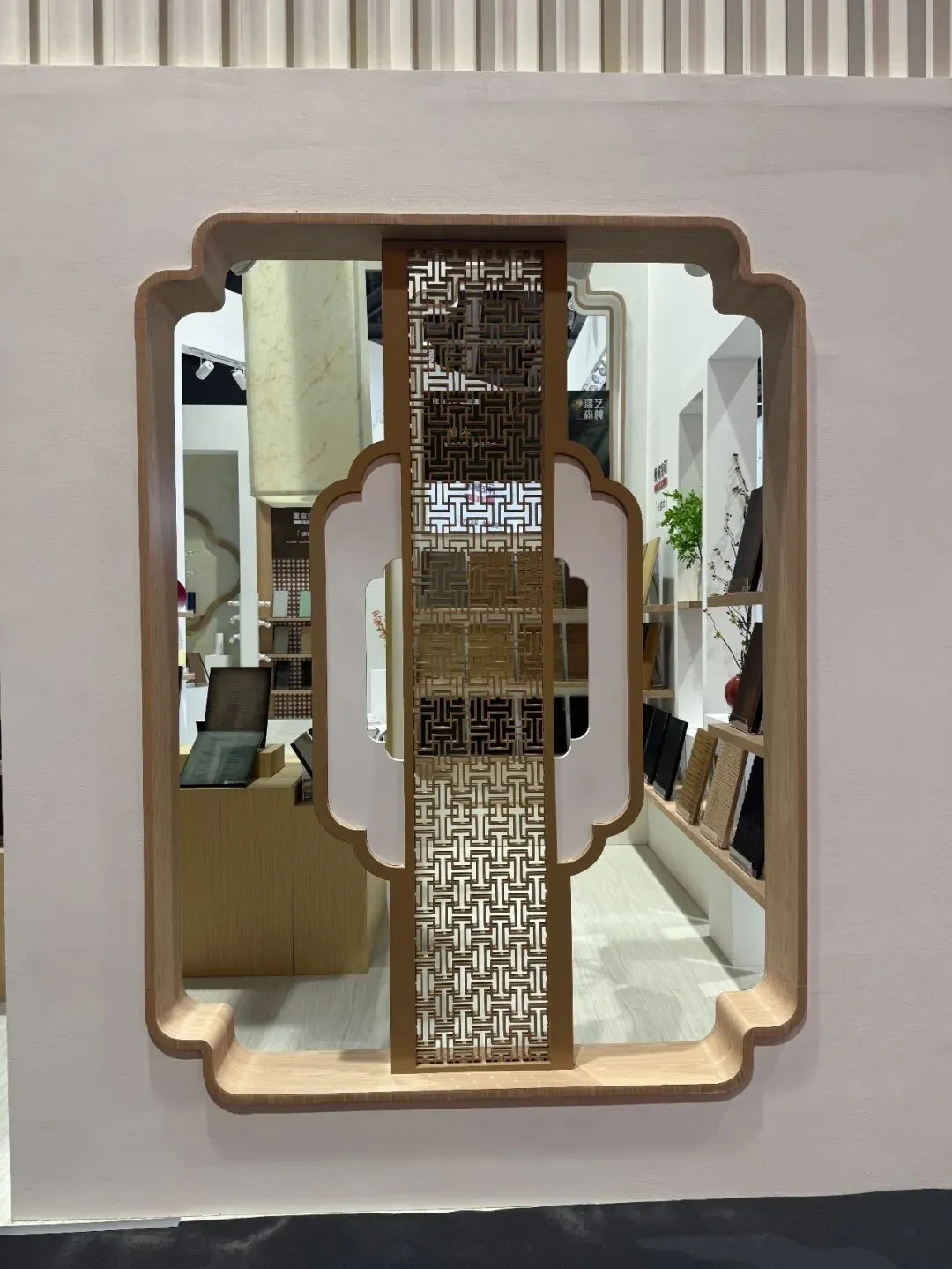 表格元素设计解析文化溯源外框造型采用海棠形(如意云纹)收边,四角做圆润的弧形过渡,替代了传统中式的直角硬边,弱化了厚重感,线条流畅柔和,兼具装饰性与安全性海棠形、如意纹是中式经典吉祥符号,寓意 “如意圆满、富贵平安”,是传统门窗、花格的经典造型中心花格采用万字纹(回纹变体) 通花设计,线条横竖交错、规律重复,形成通透的视觉效果,既保证了空间的半遮挡性,又不阻断光线与视线万字纹(卍字纹)是中式传统纹样,寓意 “万字不到头、福寿绵延”,回纹则有 “生生不息” 的吉祥意涵层次结构采用三层递进式结构:最外层木质大框 → 中间层白色云形装饰板 → 中心金属花格,通过前后错落的层次,打造出丰富的立体感与纵深感,避免了平面设计的单调中式传统隔扇、屏风的 “框 - 芯 - 边” 结构的现代简化,保留了传统的层次逻辑比例控制整体遵循黄金比例,中心花格的宽度、云形板的尺寸、外框的留白都经过精准计算,视觉上平衡协调,没有冗余元素中式传统营造的 “材分制” 比例逻辑,结合现代极简设计的留白美学
