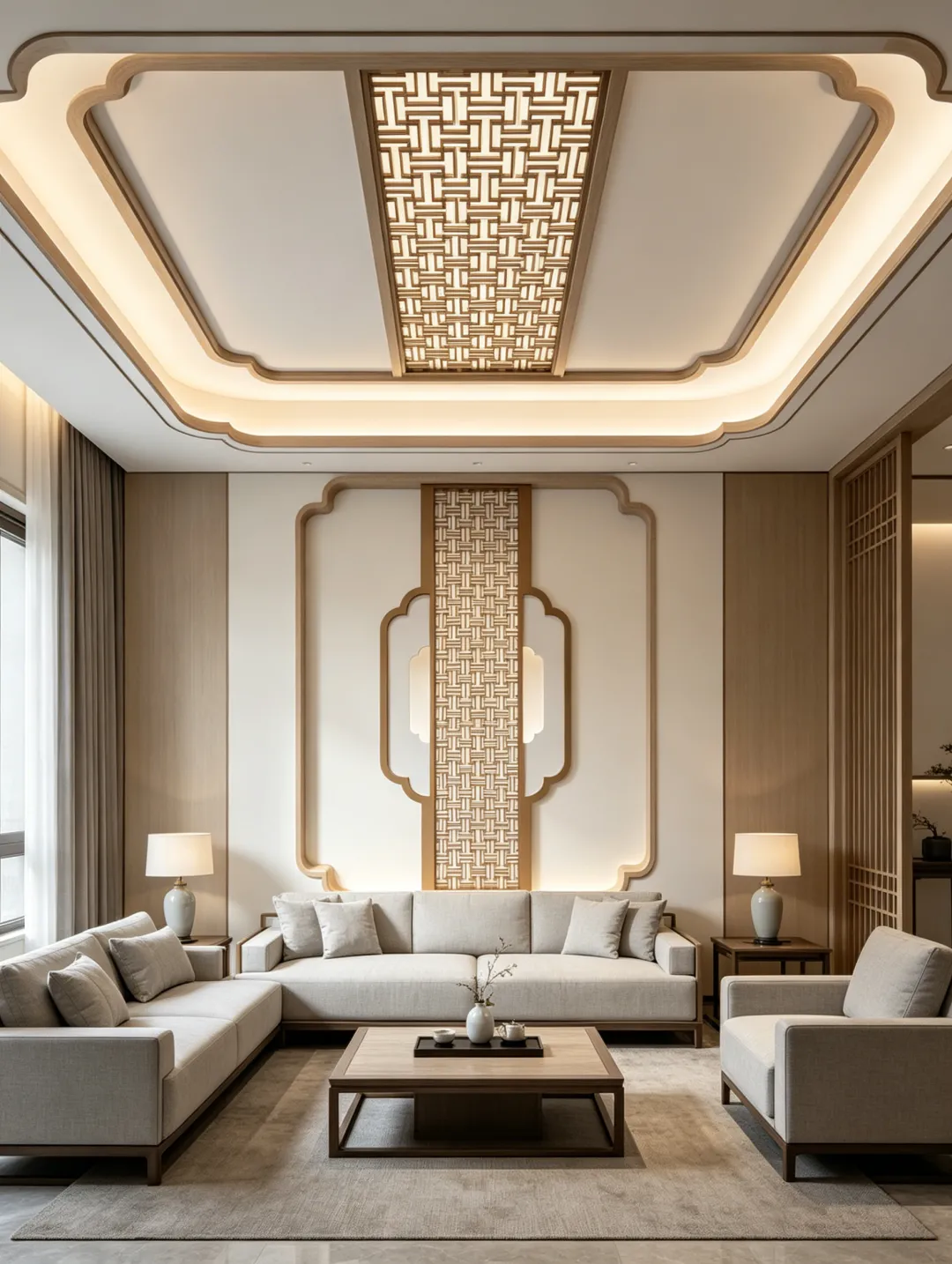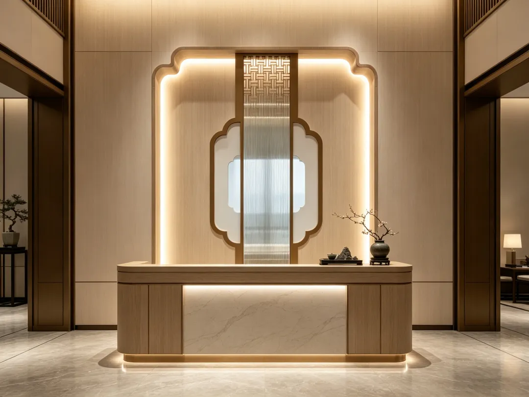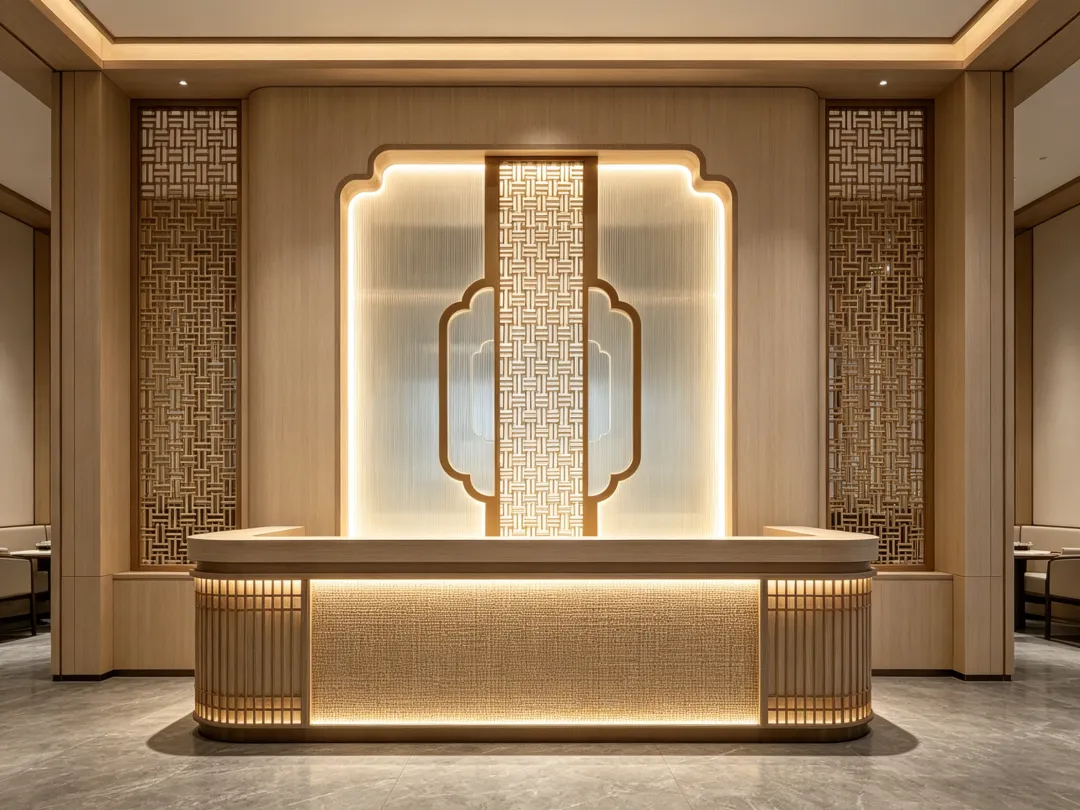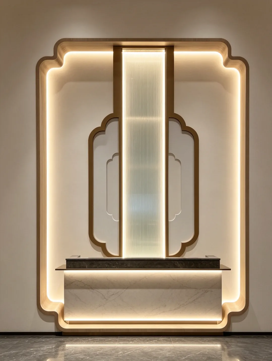 表格元素设计解析文化溯源外框造型采用海棠形(如意云纹)收边,四角做圆润的弧形过渡,替代了传统中式的直角硬边,弱化了厚重感,线条流畅柔和,兼具装饰性与安全性海棠形、如意纹是中式经典吉祥符号,寓意 “如意圆满、富贵平安”,是传统门窗、花格的经典造型中心花格采用万字纹(回纹变体) 通花设计,线条横竖交错、规律重复,形成通透的视觉效果,既保证了空间的半遮挡性,又不阻断光线与视线万字纹(卍字纹)是中式传统纹样,寓意 “万字不到头、福寿绵延”,回纹则有 “生生不息” 的吉祥意涵层次结构采用三层递进式结构:最外层木质大框 → 中间层白色云形装饰板 → 中心金属花格,通过前后错落的层次,打造出丰富的立体感与纵深感,避免了平面设计的单调中式传统隔扇、屏风的 “框 - 芯 - 边” 结构的现代简化,保留了传统的层次逻辑比例控制整体遵循黄金比例,中心花格的宽度、云形板的尺寸、外框的留白都经过精准计算,视觉上平衡协调,没有冗余元素中式传统营造的 “材分制” 比例逻辑,结合现代极简设计的留白美学