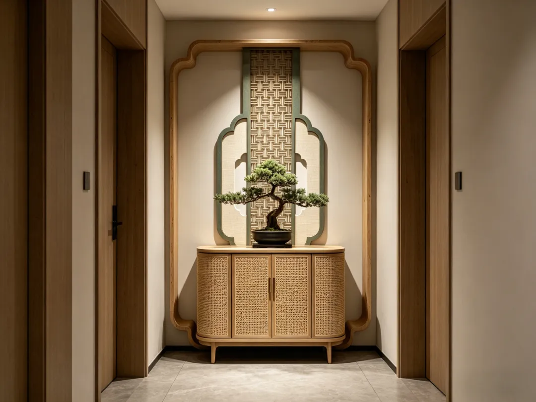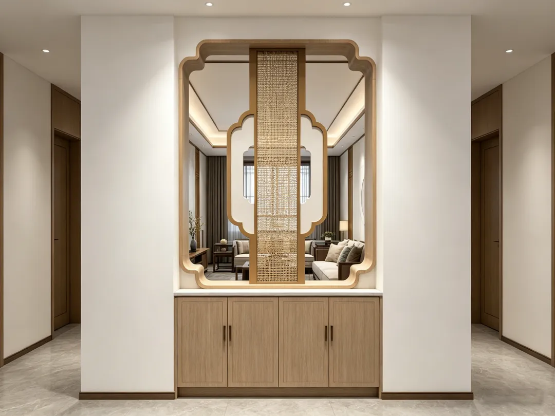 空间功能:半通透的花格设计,实现了空间的软分隔,既划分了区域,又不阻断光线与视线,让空间保持通透感,完美适配玄关、客厅、茶室等需要分区但不封闭的场景 如下图
