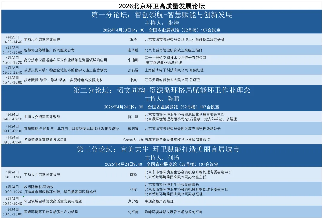 展会同期将举办“2026环卫行业创新发展论坛”,拟邀请知名教授及行业专家现场授课。其中4月23 日下午 2:30,主题《智慧环卫落地推广的问题及思考》,由北京市城市管理研究院正高级工程师崔华胜主讲,通过政策宣政宣贯,紧扣“创新、智慧”两大核心维度,聚焦数字技术与环卫场景的深度融合,探讨科技赋能环卫作业升级路径,为智慧城市建设注入环卫动能。4月24 日上午 9:00,主题《智慧赋能·全民参与——北京市可回收物便民回收体系建设路径》,由市城市管理委固废处副处长戴志锋主讲,围绕北京市可回收物便民回收体系,介绍“点—站—中心”三级网络与智能回收机制建设情况,依托一网统管智慧平台实现线上预约、精准调度、实时统计,健全两网融合全链条,以及2026-2028年北京市可回收物体系建设的重点任务和具体举措...还有更多精彩分享...