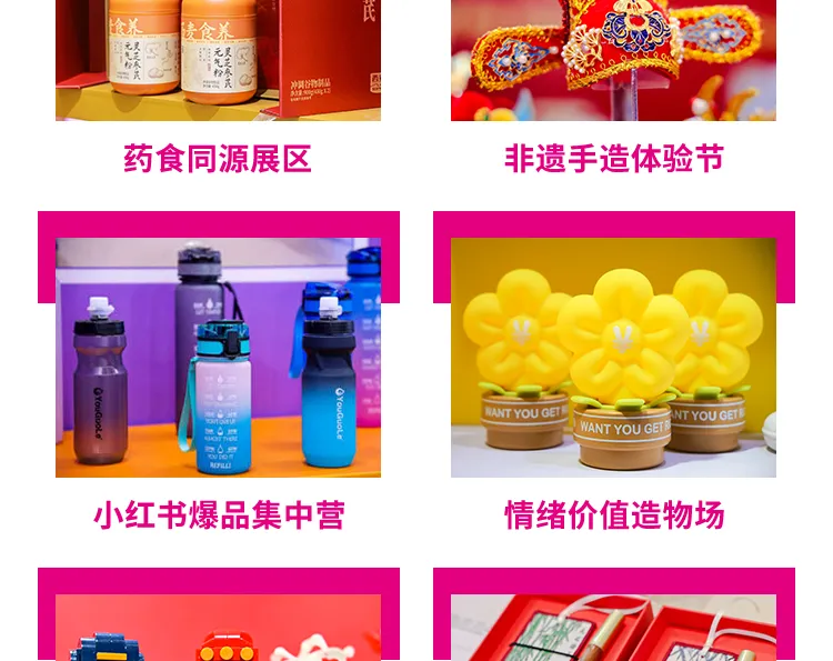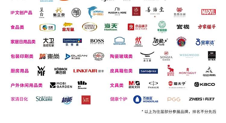 展品涵盖:食品类、陶瓷、文具、包装、促销品、收藏品、小家电、工艺礼品、美容用品、健康用品、家庭用品、箱包皮具、家居饰品、移动数码、文化用品、汽车用品、婴童用品、水晶、玻璃、家用纺织品、运动及户外、旅游用品、钟表、珠宝及时尚饰品等。