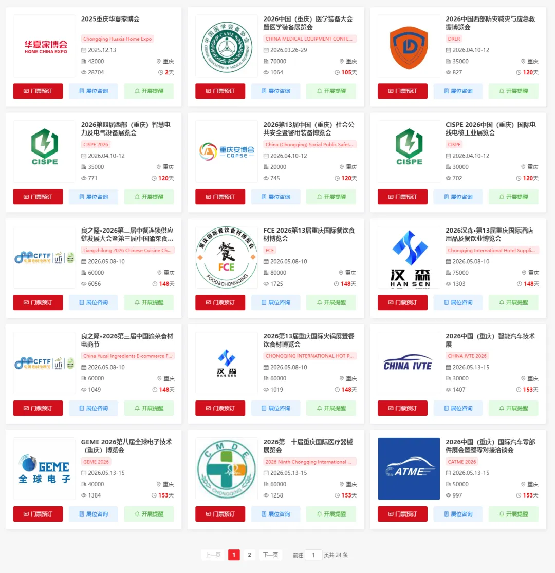 2026重庆下半年将举办多场重要的展会活动,涵盖了家具、食材、餐饮、火锅、电子元器件、医疗器械、汽车、半导体、汽车制造技术、汽车配件、智能制造、橡塑、美容、建材、地坪、建筑工程、汽车、摩托车、消费品、食材、宠物展等多个领域。小编为大家整理了2026下半年重庆展会排期表,希望能帮助你规划行程。末文获取重庆展会门票预约入口~(大多门票限时免费)