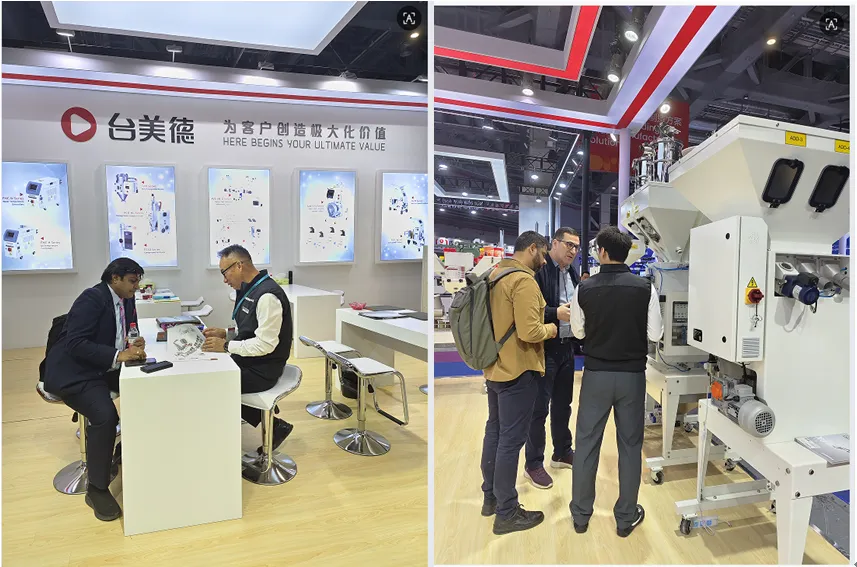 展会现场,台美德展位宾客盈门、咨询不断。重点展出的蜂巢式除湿干燥机、静音强力粉碎机、高精度称重拌料机、计量机等核心产品,集中展现了公司在节能、高效、智能、稳定方面的技术优势,完美契合当下橡塑行业绿色生产、智能升级的发展趋势,吸引了众多国内外专业买家、行业伙伴与媒体的广泛关注。