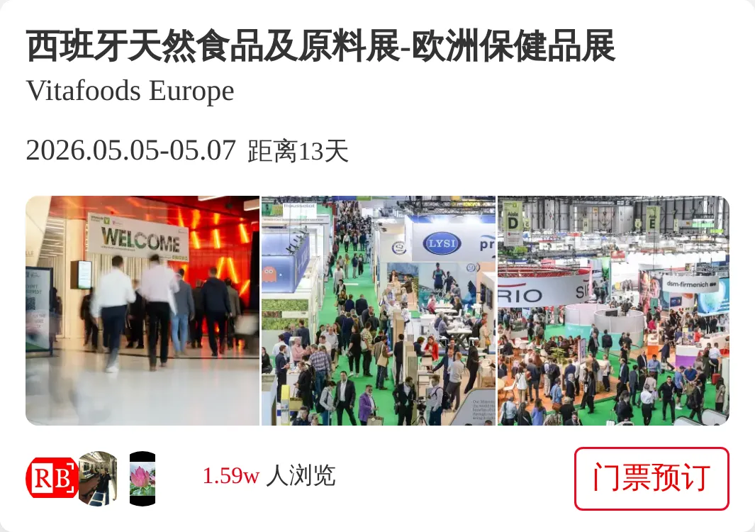 西班牙天然食品及原料展览会(Vitafoods Europe)近1100多家展商,成功吸引了来自162个国家和地区的近25000名行业观众参与,是全球健康和营养食品行业最佳的沟通、合作和创新的贸易盛会。