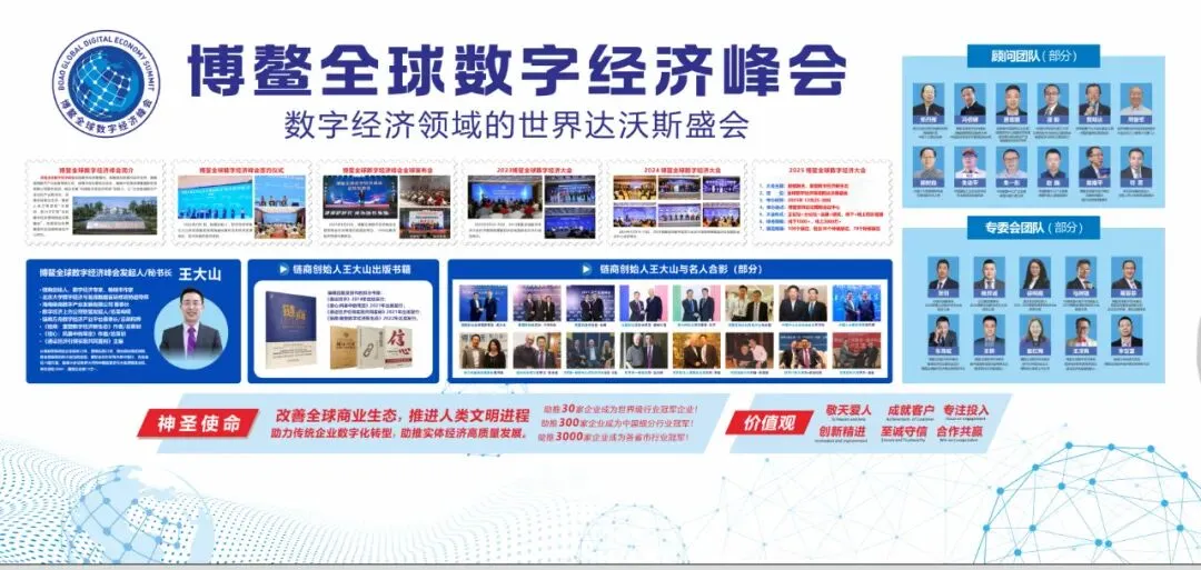 博鳌全球数字经济大会,是在国家相关部委指导、海南省及琼海市相关部门鼎力支持下,由博鳌全球数字经济峰会组委会主办,海南链商数字产业发展有限公司、海南中远海运博鳌国际会展有限公司、琼海市会议展览业协会等单位联合发起的全球性数字经济高端盛会。博鳌全球数字经济大会以“共建数字命运共同体”为初心,以“加快推进数字产业化和产业数字化,改善全球商业生态,推动人类文明进程”为使命,定期定址于博鳌亚洲论坛国际会议中心举办,致力于打造“全球数字经济领域的达沃斯盛会”。