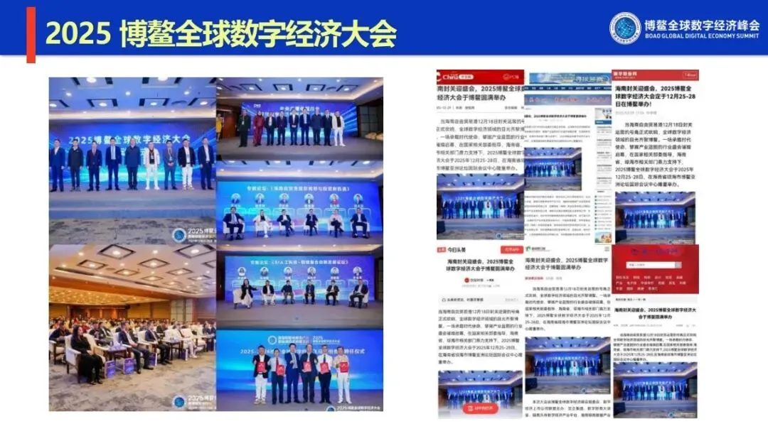 - 2025第三届大会:以“数据赋能新质生产力,数链融合高质量发展”为核心主题,于12月25-28日举办。恰逢海南自贸港封关运营,博鳌全球数字经济大会增设“海南自由贸易港国际战略与投资新机遇”主题论坛,聚焦自贸港数字经济投资蓝海,举办“飞马奖”颁奖盛典,开展琼粤科技合作专项考察,搭建政企高效对接平台,推动数字经济成果转化与产业落地。