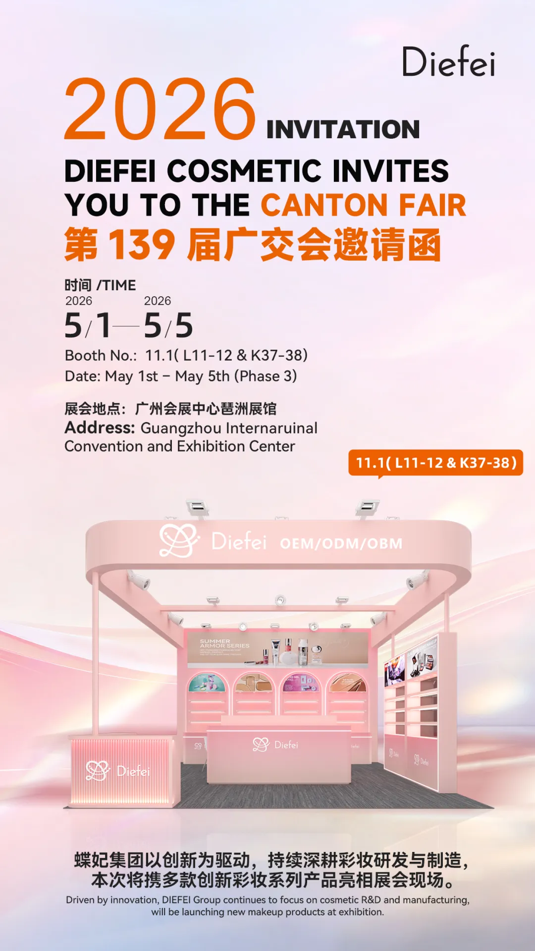 The 139th Canton Fair is about to open!Driven by innovation, DIEFEI Group continues to focus on cosmetic R&D and manufacturing,bringing a range of innovative makeup products to the exhibition.