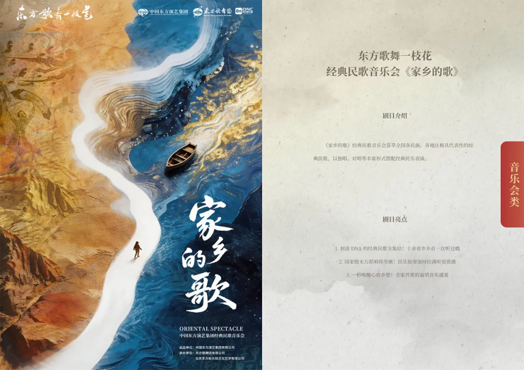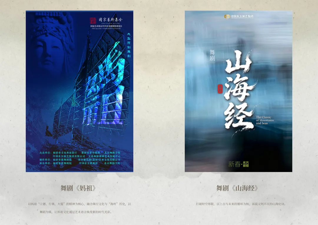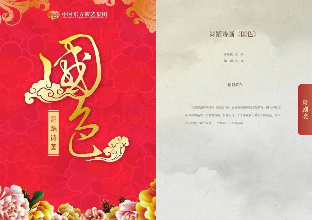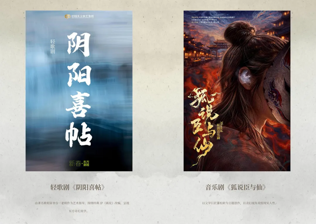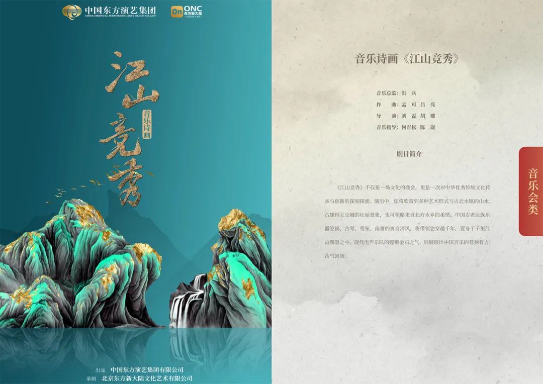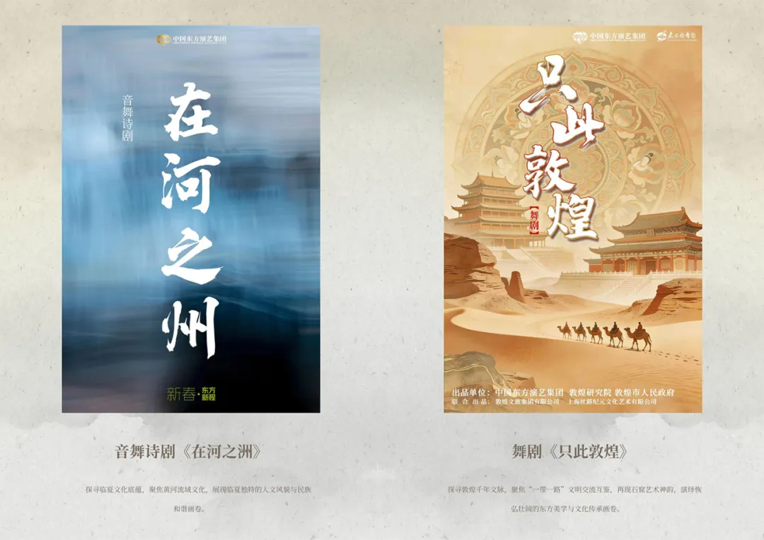 中国东方演艺集团以音乐舞蹈创作和演出作为龙头牵引,围绕艺术创作、各类演出、对外交流、艺术教育、文旅融合、数字创新、剧院运营七大业务板块,努力实现艺术创新、事业发展,做到 " 双效统一”。近年来,创作了舞蹈诗剧《只此青绿》、现代舞诗剧《诗忆东坡》、舞剧《天下大足》《永乐未央》《海的一半》《孩儿枕·家和兴》《唯我青白》、音乐剧《飞天》《大江东去》《绽放》《星辰》《寻找李二狗》《将进酒》《潮起东方》、音乐会《江山竞秀》、国潮雅读《乐·界》、舞蹈诗画《国色》、舞乐《中国故事·十二生肖》、古筝情境音画《如梦令》、歌舞剧场《美美与共》等一批舞台艺术精品。作品荣获文华大奖、“五个一工程”优秀作品奖、社会效益和经济效益相统一十大精品演出项目等多个奖项。出品电影《只此青绿》,推动舞台艺术与现代电影艺术跨界融合。